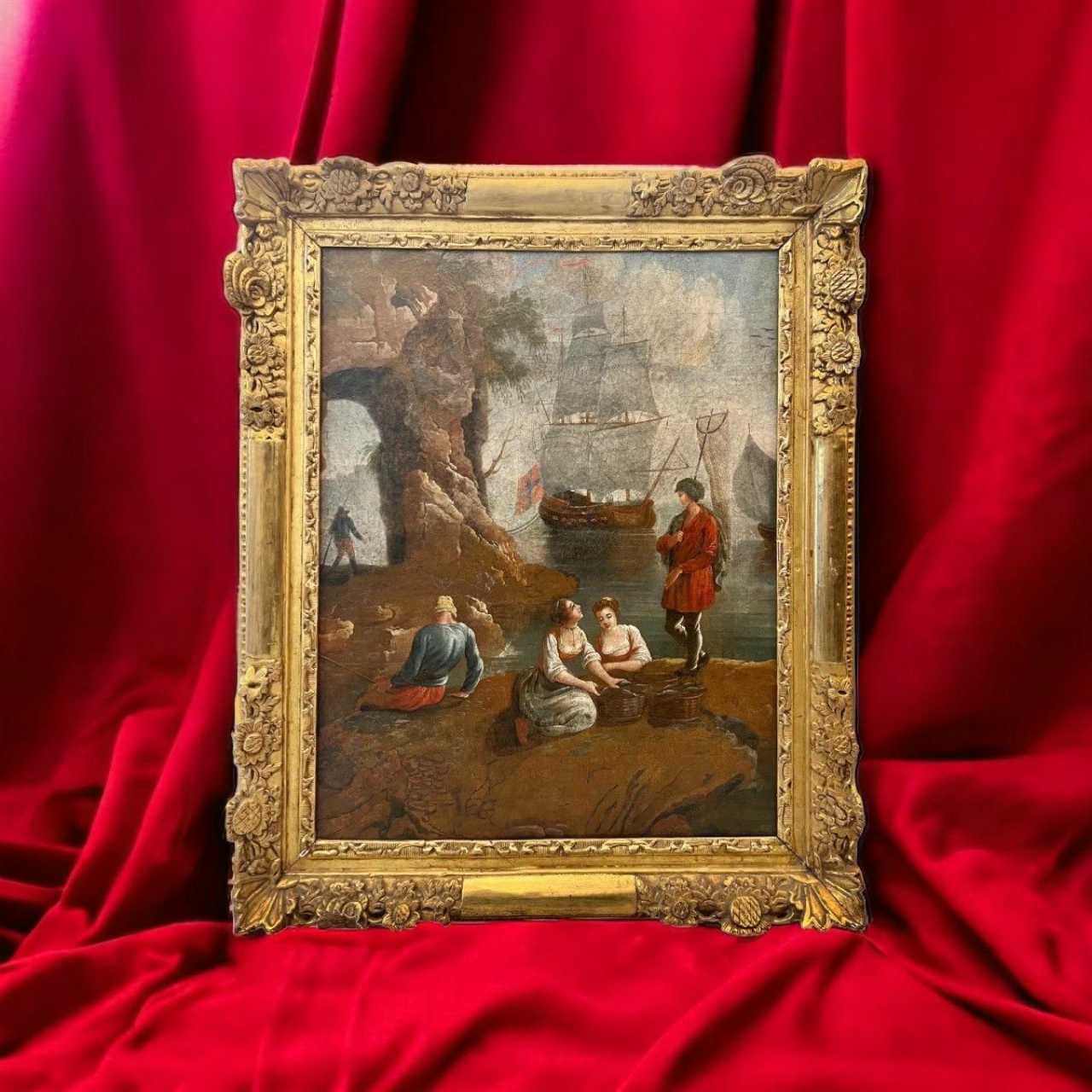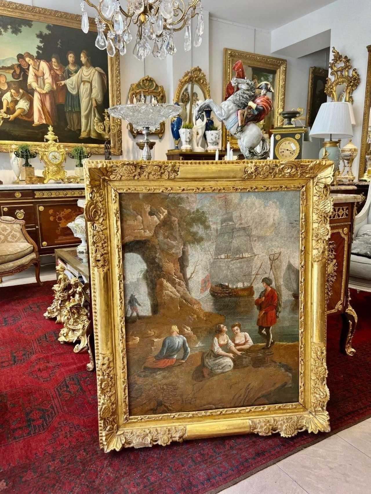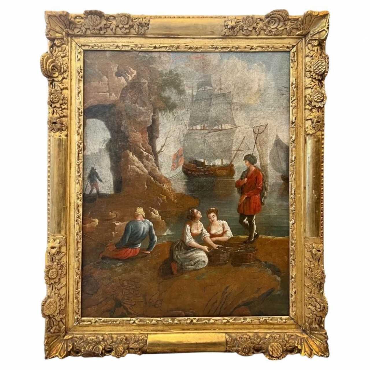 We present you this exquisite 18th-century coastal tableau that captures the collaborative efforts of both men and women weaving baskets along the shore while men prepare for a fishing expedition, all in the artistic manner reminiscent of Claude-Joseph Vernet (1714-1789). This work is believed to be by a follower or imitator of the artist. The backdrop of the painting is dominated by a massive early sailing ship. This artwork is elegantly enclosed within an 18th-century gilded wooden frame, and the overall dimensions, including the frame, are 97 cm in height in 85 cm in width.Claude-Joseph Vernet (1714-1789) was a French landscape and marine painter known for his remarkable depictions of coastal scenes and seascapes. He played a significant role in the development of the veduta genre, which specialised in panoramic views and landscapes. Vernet was particularly renowned for his marine paintings, characterised by their vivid portrayal of light, atmosphere, and the interplay of nature and human activity along the coast.