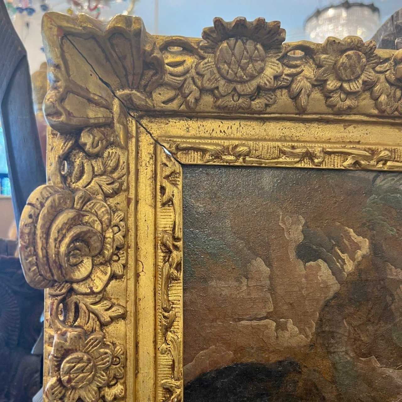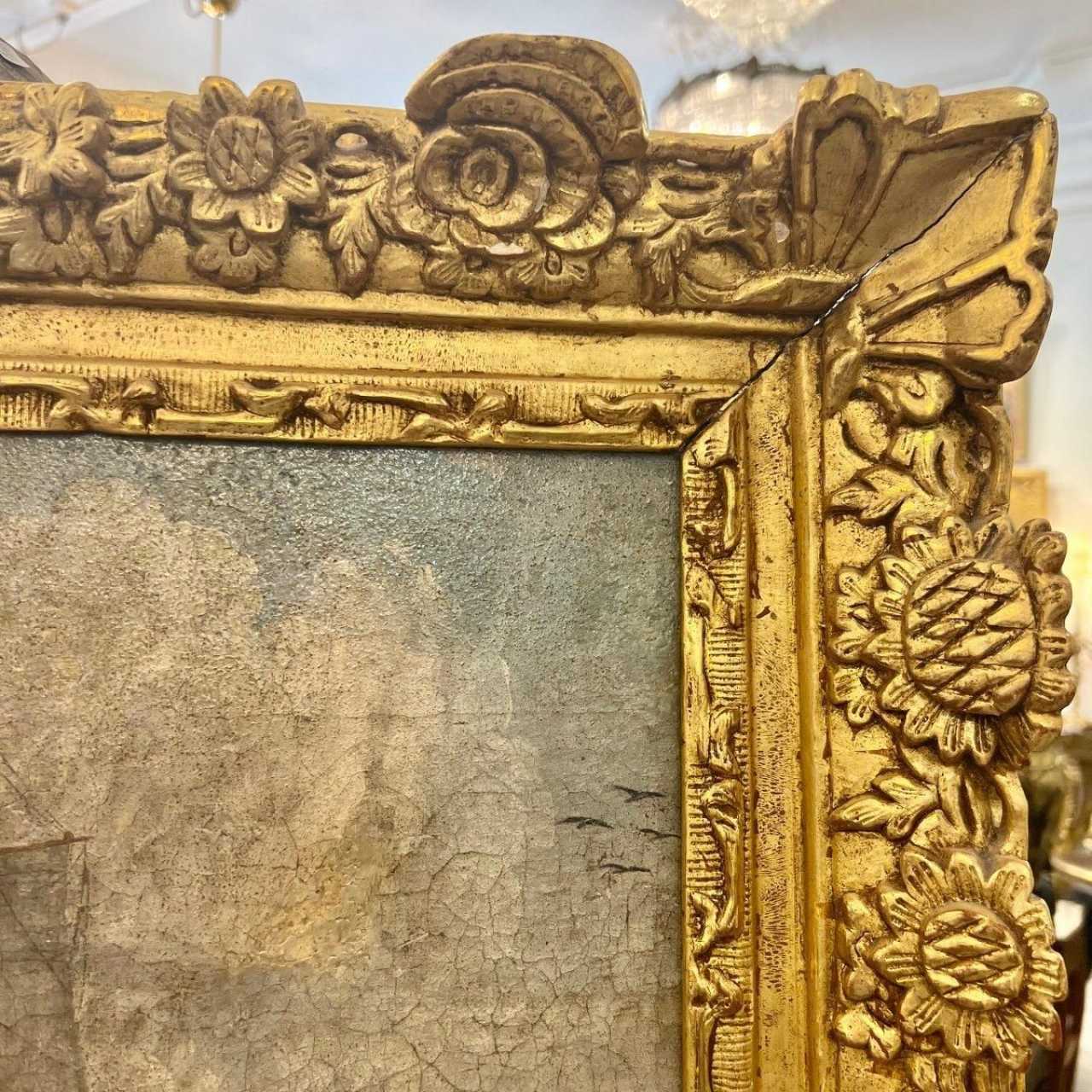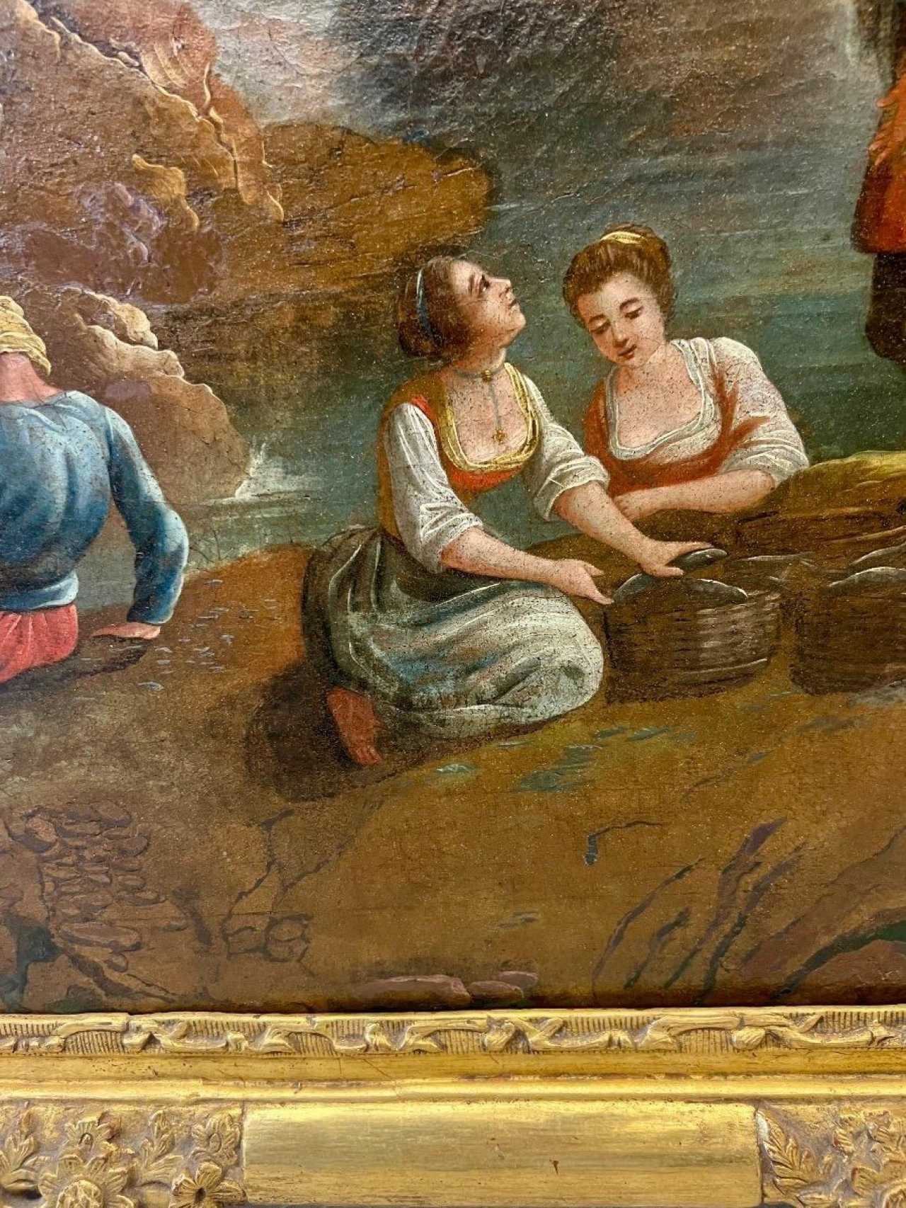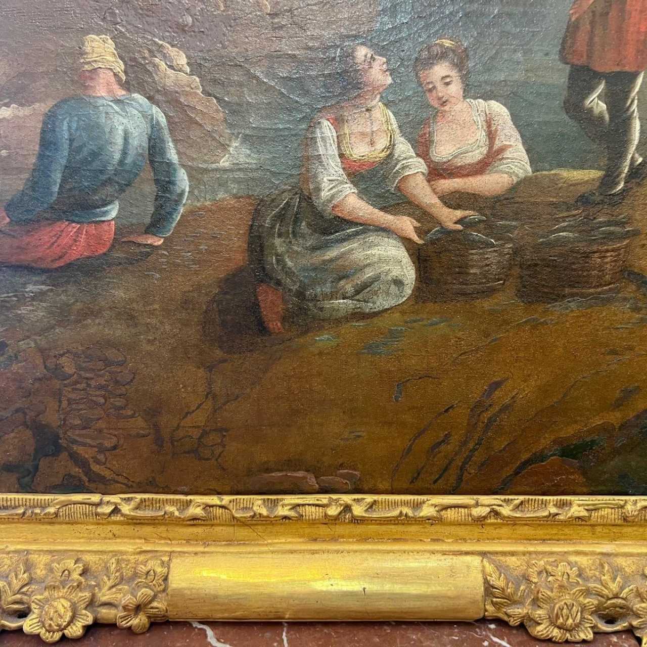 We present you this exquisite 18th-century coastal tableau that captures the collaborative efforts of both men and women weaving baskets along the shore while men prepare for a fishing expedition, all in the artistic manner reminiscent of Claude-Joseph Vernet (1714-1789). This work is believed to be by a follower or imitator of the artist. The backdrop of the painting is dominated by a massive early sailing ship. This artwork is elegantly enclosed within an 18th-century gilded wooden frame, and the overall dimensions, including the frame, are 97 cm in height in 85 cm in width.Claude-Joseph Vernet (1714-1789) was a French landscape and marine painter known for his remarkable depictions of coastal scenes and seascapes. He played a significant role in the development of the veduta genre, which specialised in panoramic views and landscapes. Vernet was particularly renowned for his marine paintings, characterised by their vivid portrayal of light, atmosphere, and the interplay of nature and human activity along the coast.