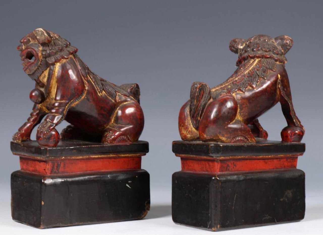 19th Century Pair of Chinese Guardian Lions in Red and Gold Lacquer Naturholz 19th century