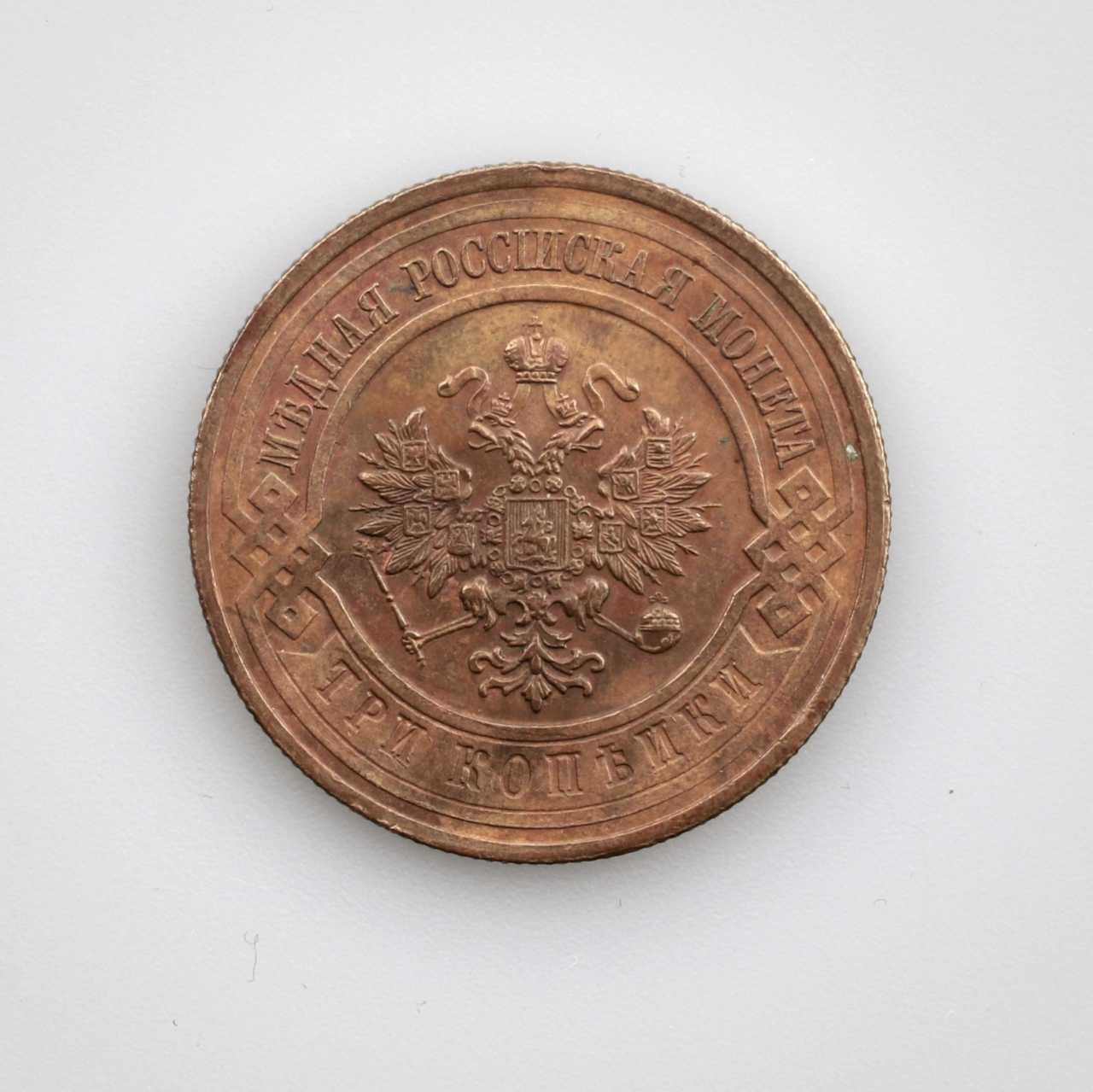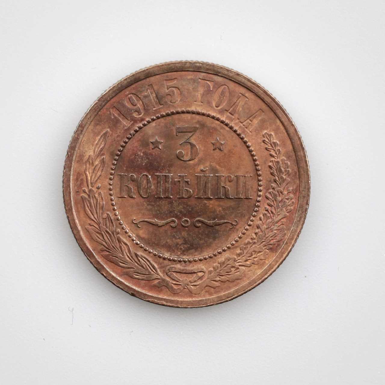 3 kopecks en cuivre, 1915.Avers: 3 kopecks 1915 dans une couronne de laurier.Au revers: une pièce de monnaie russe à trois kopecks en cuivre dans l`ornement autour des armoiries.Poids: 9,77 grDiamètre 2,8 cmEpaisseur 2 mm