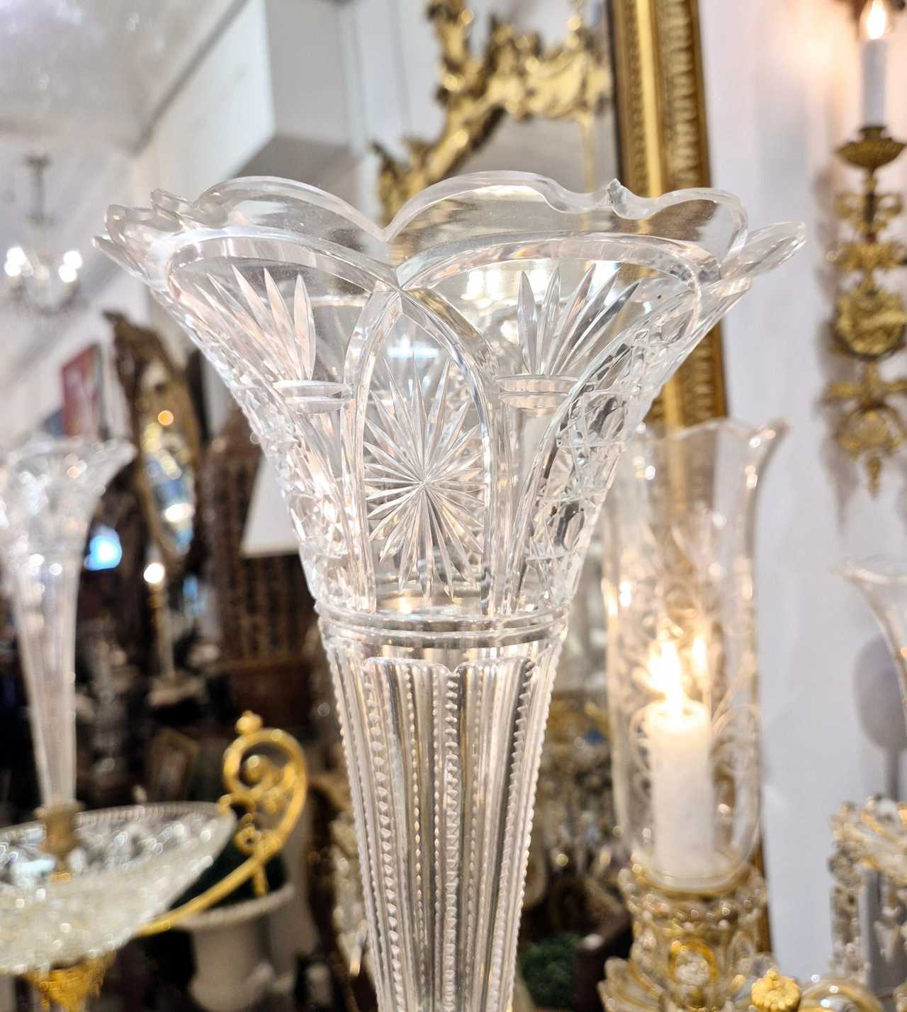 Hand-cut Baccarat crystal centerpiece mounted on chiseled gilt bronze serving as a bowl or fruit stand. This majestic piece features a large Baccarat crystal bowl topped with a long cornet vase (43 cm) which makes it spectacular.The base rests on four claw feet and consists of a domed half-sphere in cut crystal intersected by the foot of the bowl. This section is equally ornate as it consists of a very finely chiseled bronze structure supporting the rim of the basin, from which two large, scalloped handles adorned with interlacing foliage and a pendant representing a laurel crown extend.The chiseling and gilding of the bronze are particularly elegant in this piece. In the 19th century, such pieces were usually found on the beautiful tables of European aristocracy, serving as a ceremonial bowl or fruit stand. This opulent and refined centerpiece is an object that will stand out in your interior or at a reception.Height: 69 cmDiameter: 43 cmBase: 14 x 14 cmHeight of the cornet vase: 44 cm