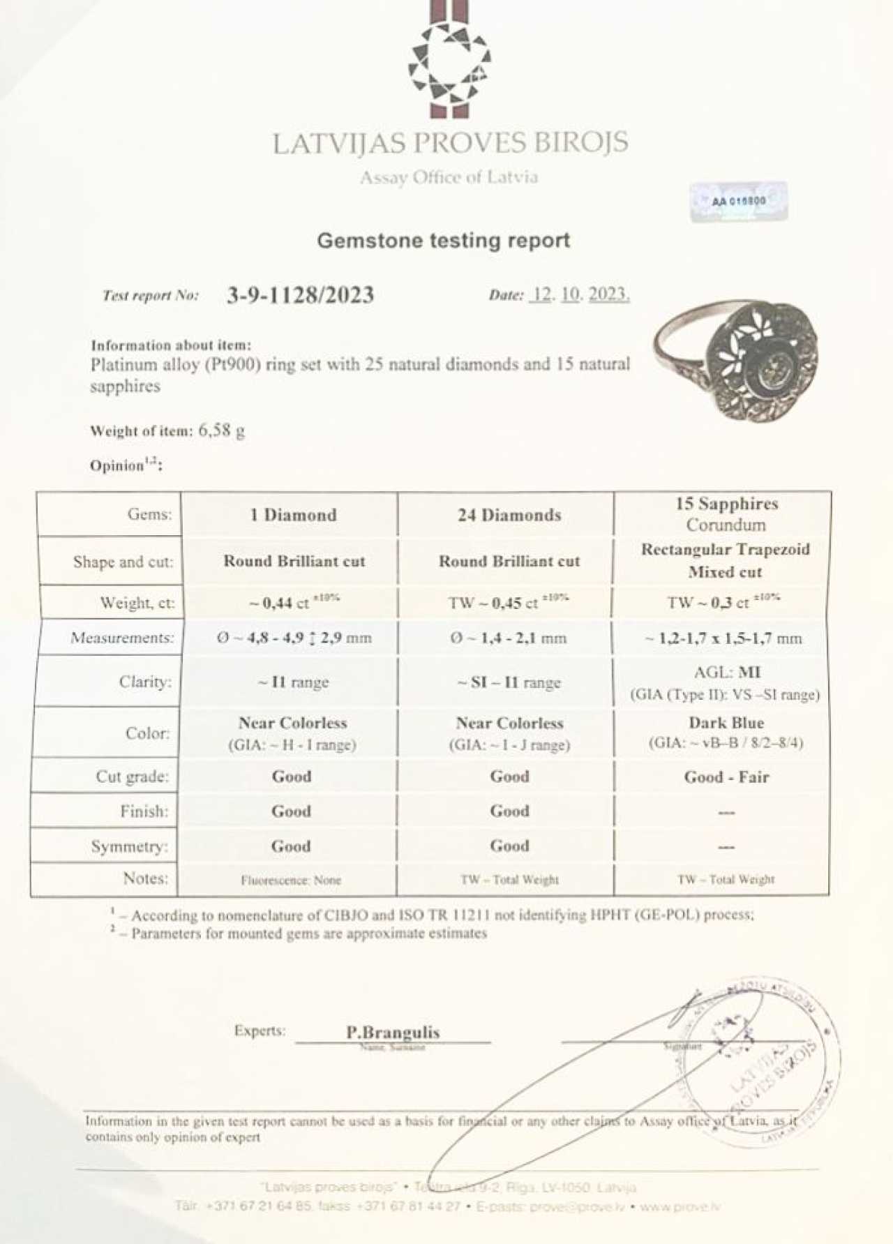 Bague fleur Art Déco en platine 900 avec diamants et saphirs. Diamant central : 0,44 carats. I1. 24 diamants : 0,45 carats. SI-I1. 15 saphirs rectangulaires 0,3 carats. MI. Bleu foncé. Taille de bague : 17,5. Poids : 6,58 g. Certificat du bureau danalyse.