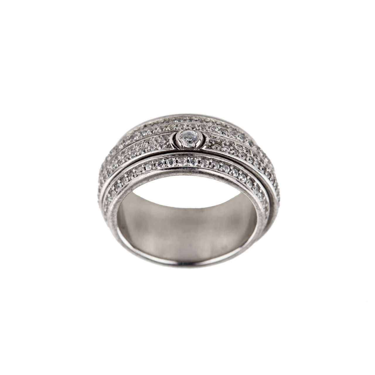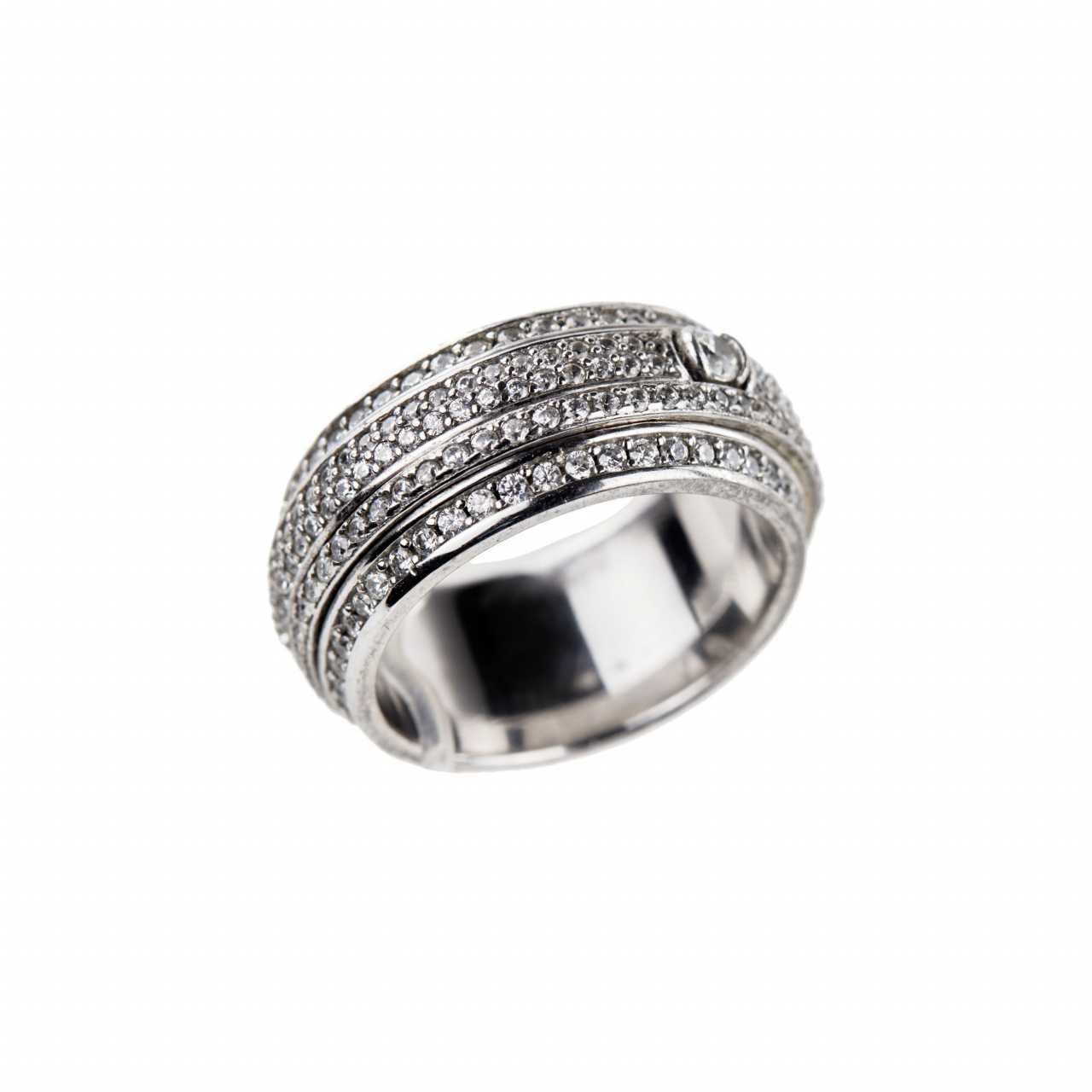 Bague en métal blanc avec strass réalisée selon le modèle Piaget. Un anneau avec deux parties en rotation libre au centre de l&39;anneau. Les strass sont situés sur tout le bord de la bague. Taille du produit : 15