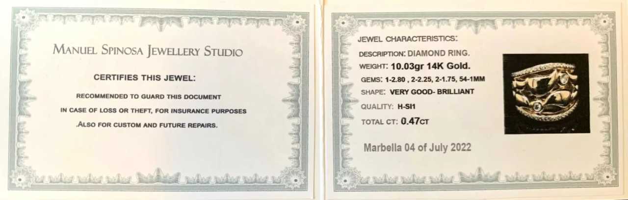 Bague en or avec diamants. Or 14 carats. Diamants : H-SI1, 0,47 ct. Poids de la bague : 10,03 gr. Certificat inclus. Taille de bague - 18.