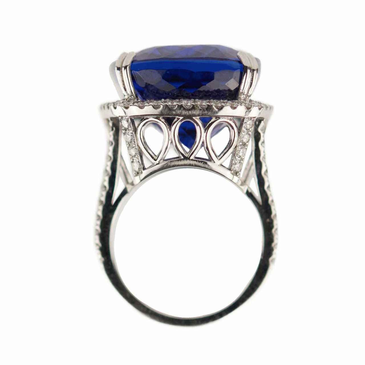 Bague en or blanc 18 carats avec tanzanite et diamants. Tanzanite : 40,51 carats. 96 diamants 1,80 carats. GVS1. Taille de bague : 17,5. Poids : 11,45 g. Certificat inclus.