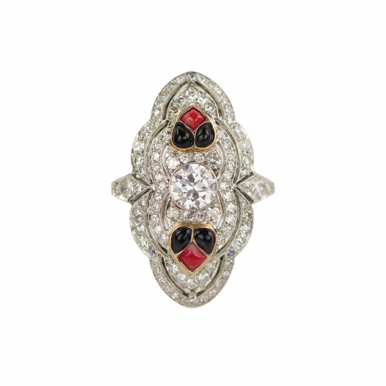 Bague ovale, or blanc avec diamants et émail, style Art Déco. 20ième siècle. Taille de bague : 18. Poids : 7,84 g.