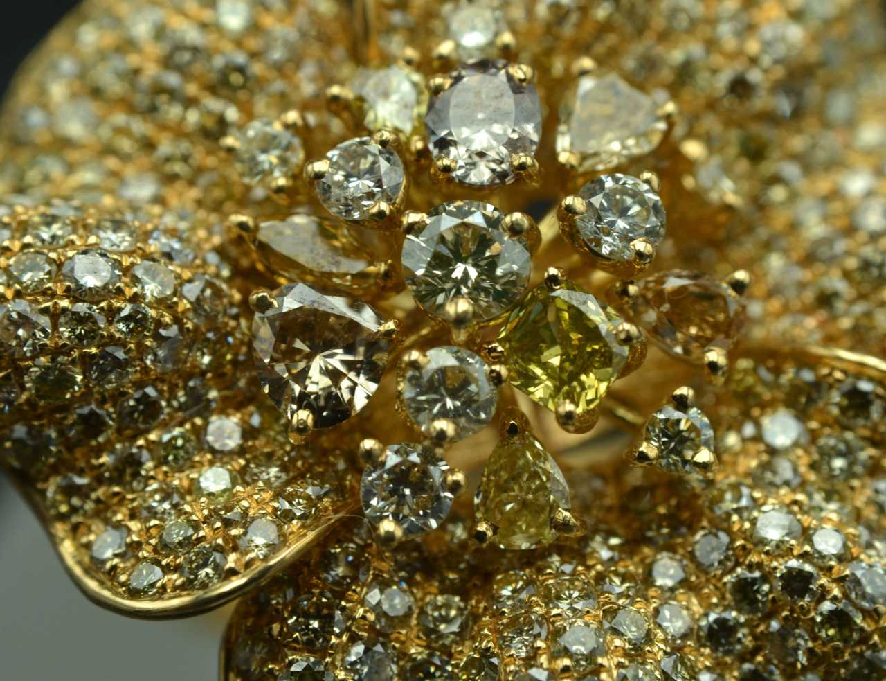 21e siècle. Or, 18 K, 357 diamants naturels (17 diamants - 1,9-4,3 mm, 1,7 ct, VS-SI, jaune clair-brun-jaune verdâtre fantaisie ; 340 diamants - 1,2-1,9 mm, 4,8 ct, VS-SI, jaune clair-brun- jaune fantaisie. Poids 20,21 g, diamètre intérieur 17,35 mm. Avec certificat.