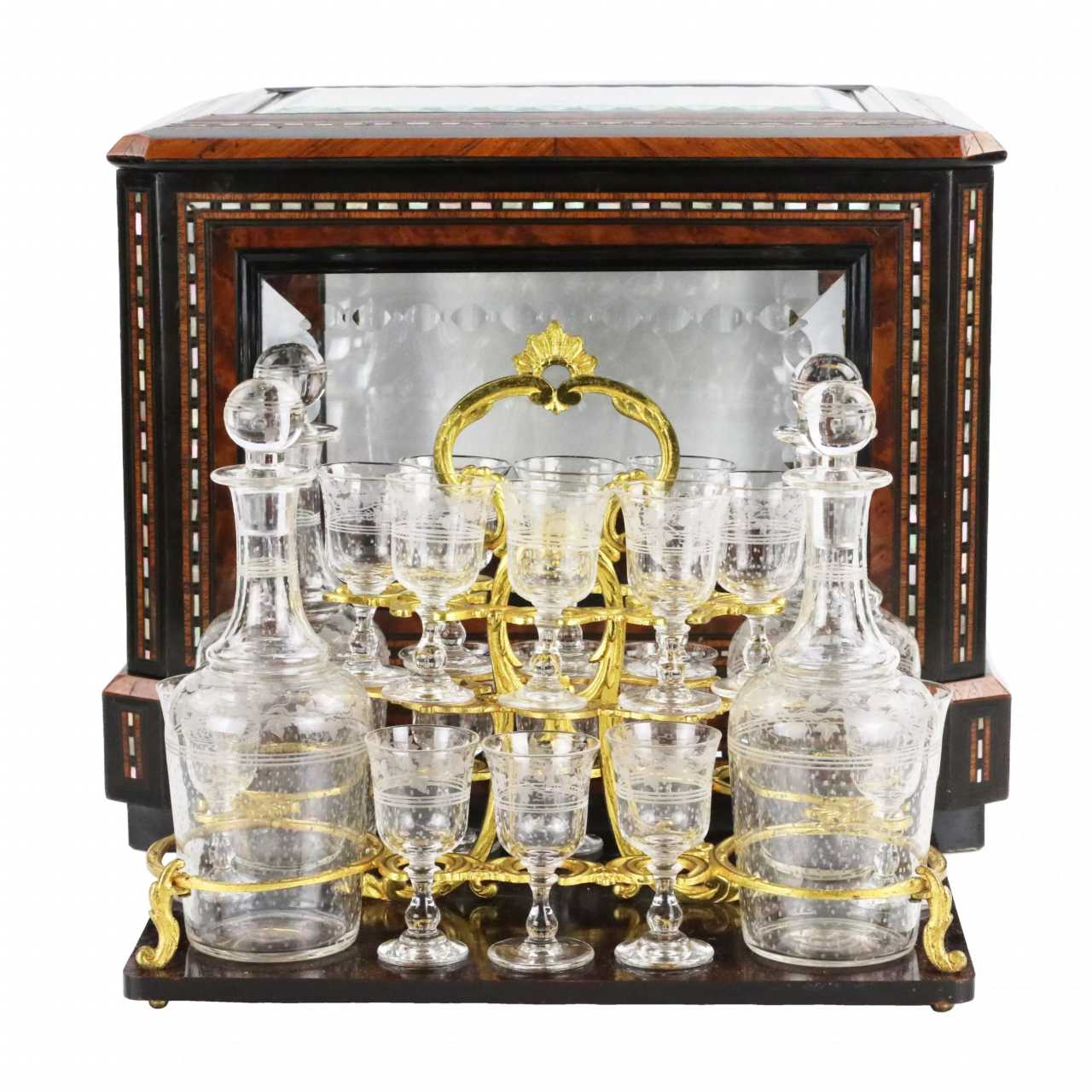 Bar à liqueurs cosy et compact en palissandre au decor de nacre, ensemble de verres biseautes. Fait dans le style d`un repertoire. Un merveilleux attribut d`un bureau pour hommes et une conversation tranquille. Entièrement garni de 16 charmants coups de baccarat (non signes) et de 4 carafes en verre fin avec gravures de vigne. Le tournant des XIXe-XXe siècles. Dimensions : 29x35x27 cm.