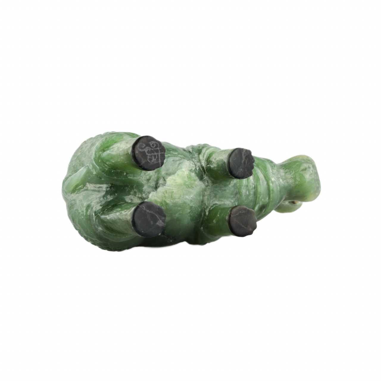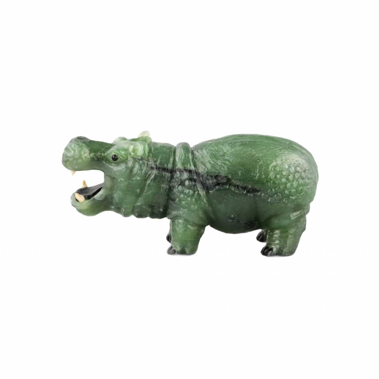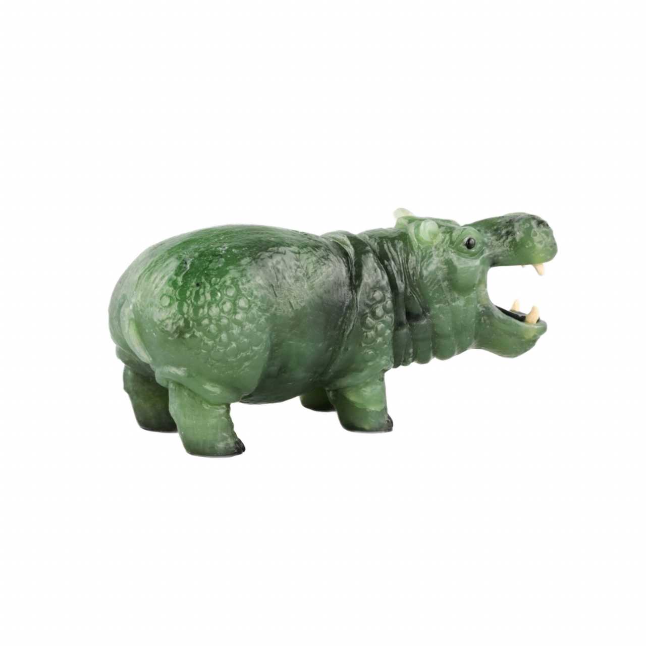 Jade, miniature tailleuse de pierre "Behemoth". La figurine finement travaillee represente un hippopotame debout avec une bouche ouverte. La corpulence et la lenteur caracteristiques sont mises en valeur par les details des oreilles, de la crête et de la queue pressee. Pierre soigneusement selectionnee, repète avec succès la texture de la peau d`un animal. Les crocs dans la bouche sont faits de defense de mammouth. Avec la base sombre des pattes, ils creent une illusion complète de credibilite. Jade : environ 128 gr. Signature de l`auteur sur la patte.