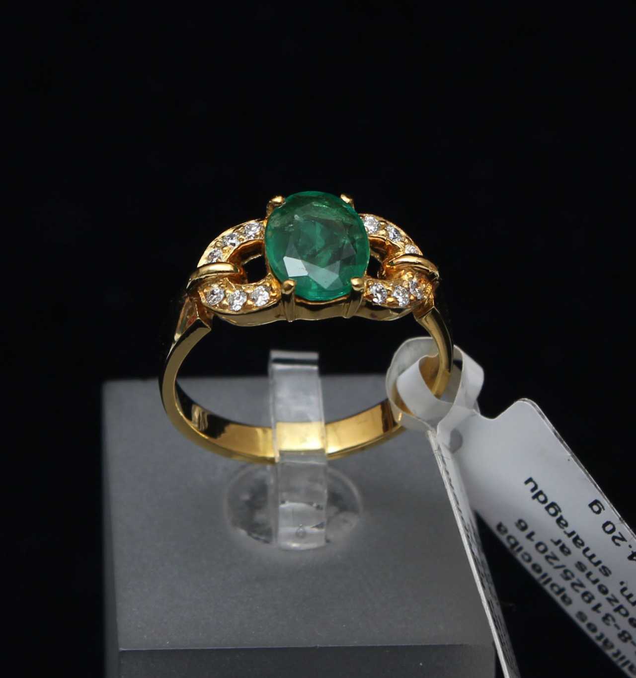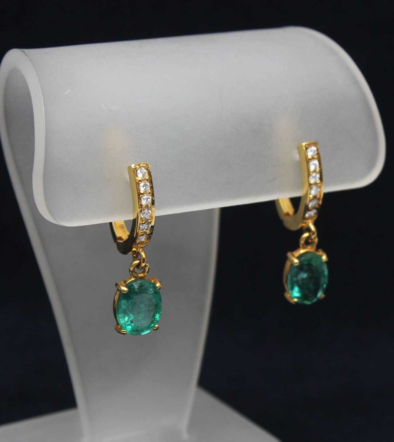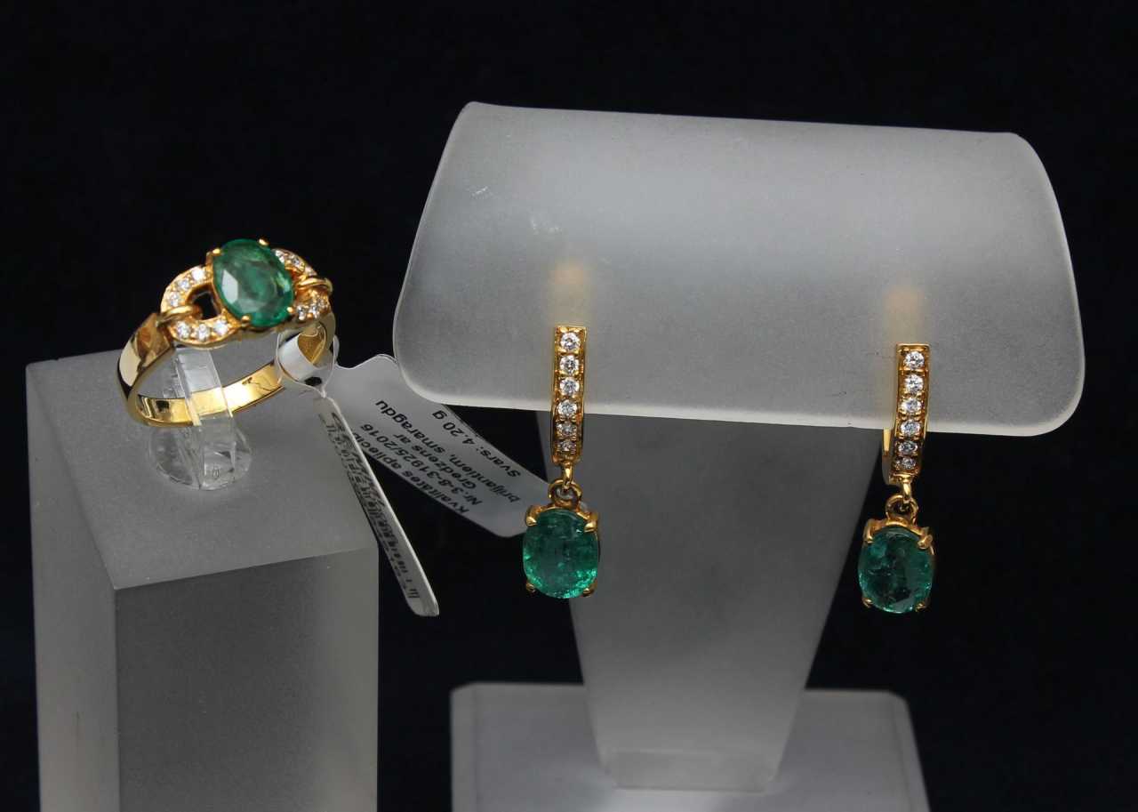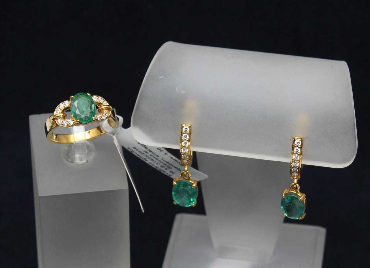 Or, proof 585, émeraudes 3x2,01 ct. diamants 0,25 ct, diamètre intérieur de la bague 17,5 mm, poids 4,2 g., taille des boucles d&39;oreilles 26 mm, poids 4,87 g