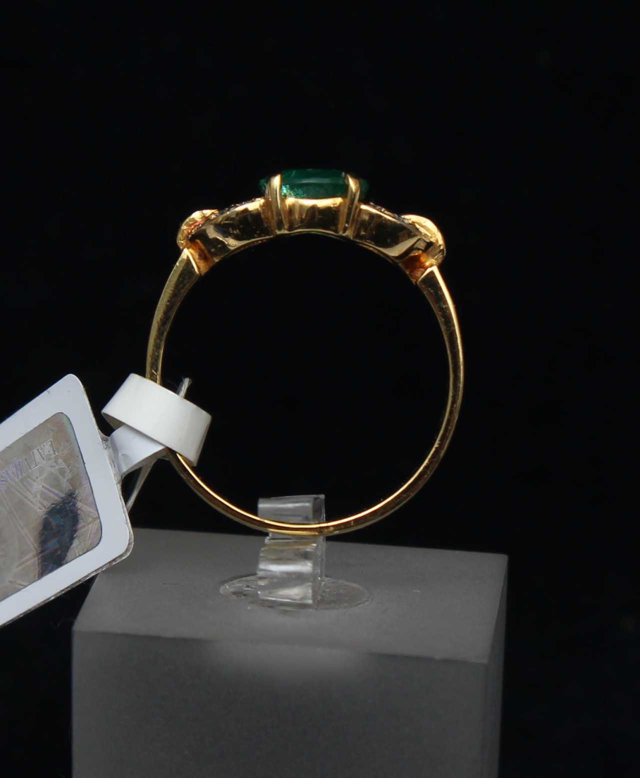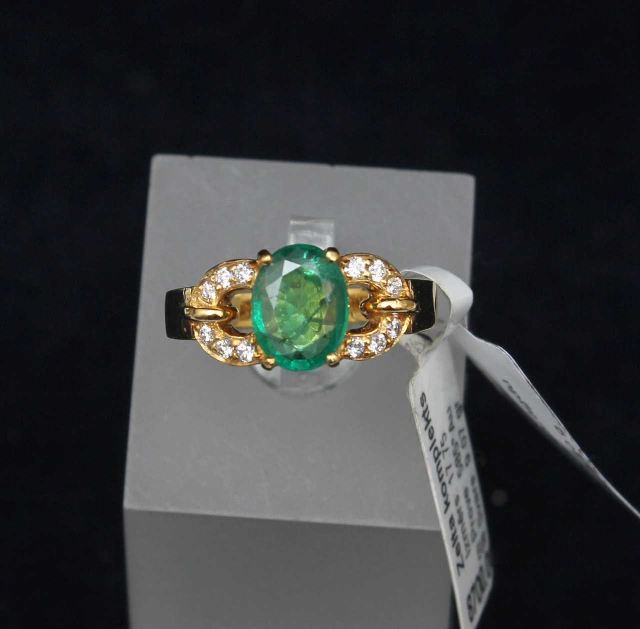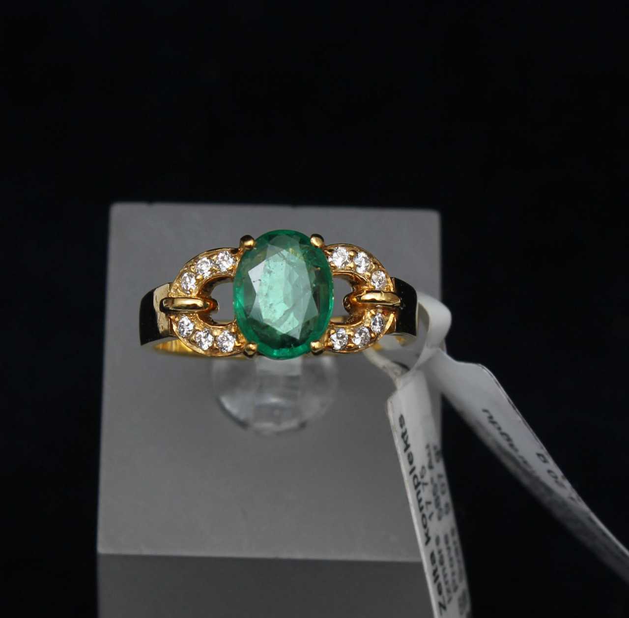 Or, proof 585, émeraudes 3x2,01 ct. diamants 0,25 ct, diamètre intérieur de la bague 17,5 mm, poids 4,2 g., taille des boucles d&39;oreilles 26 mm, poids 4,87 g