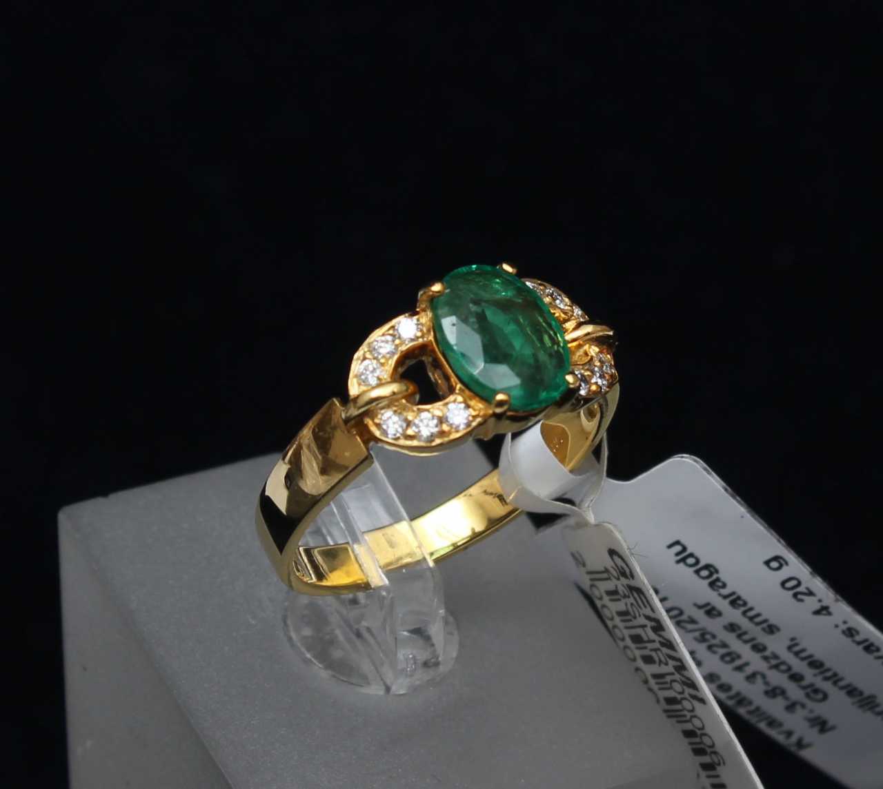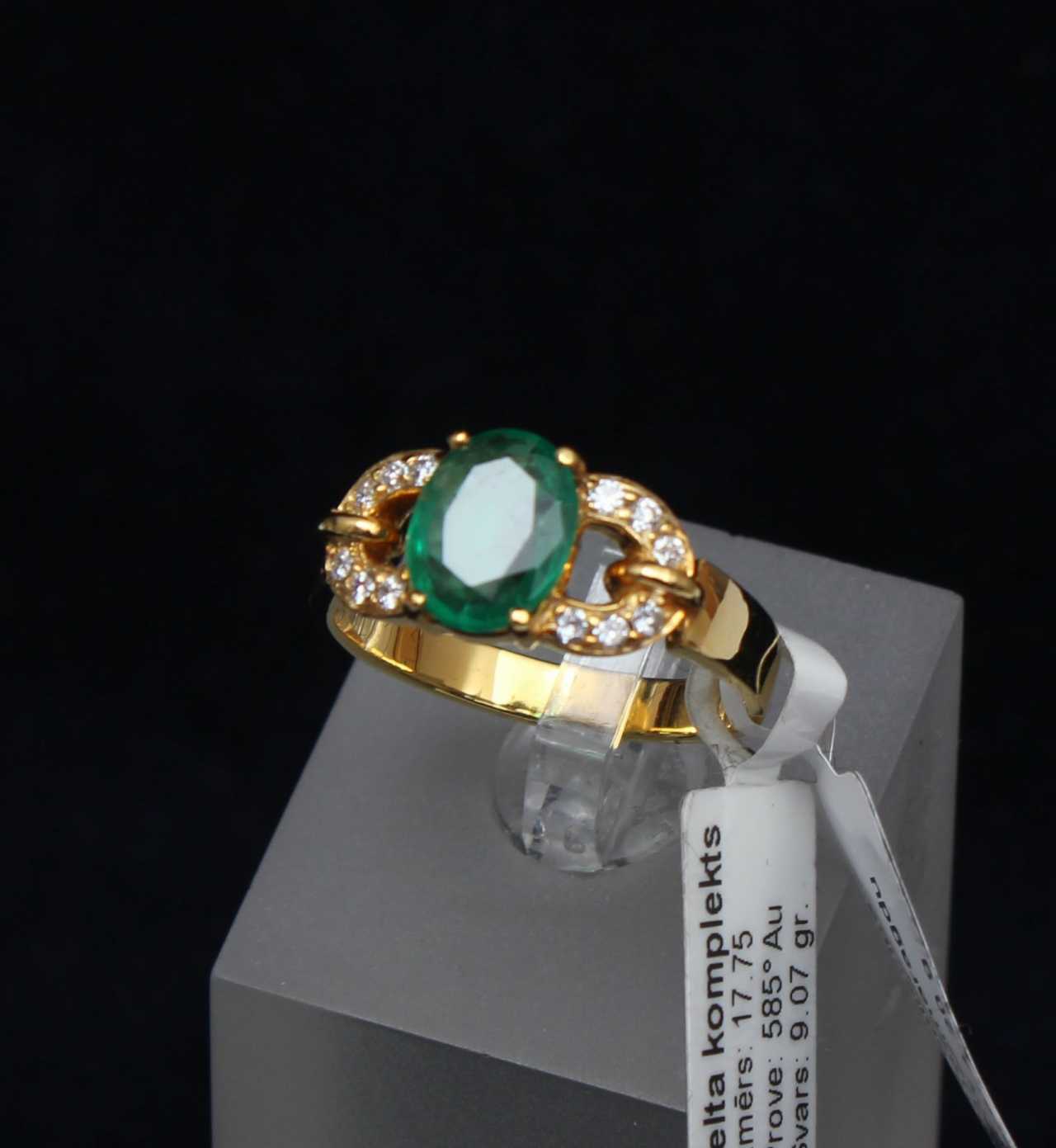 Or, proof 585, émeraudes 3x2,01 ct. diamants 0,25 ct, diamètre intérieur de la bague 17,5 mm, poids 4,2 g., taille des boucles d&39;oreilles 26 mm, poids 4,87 g