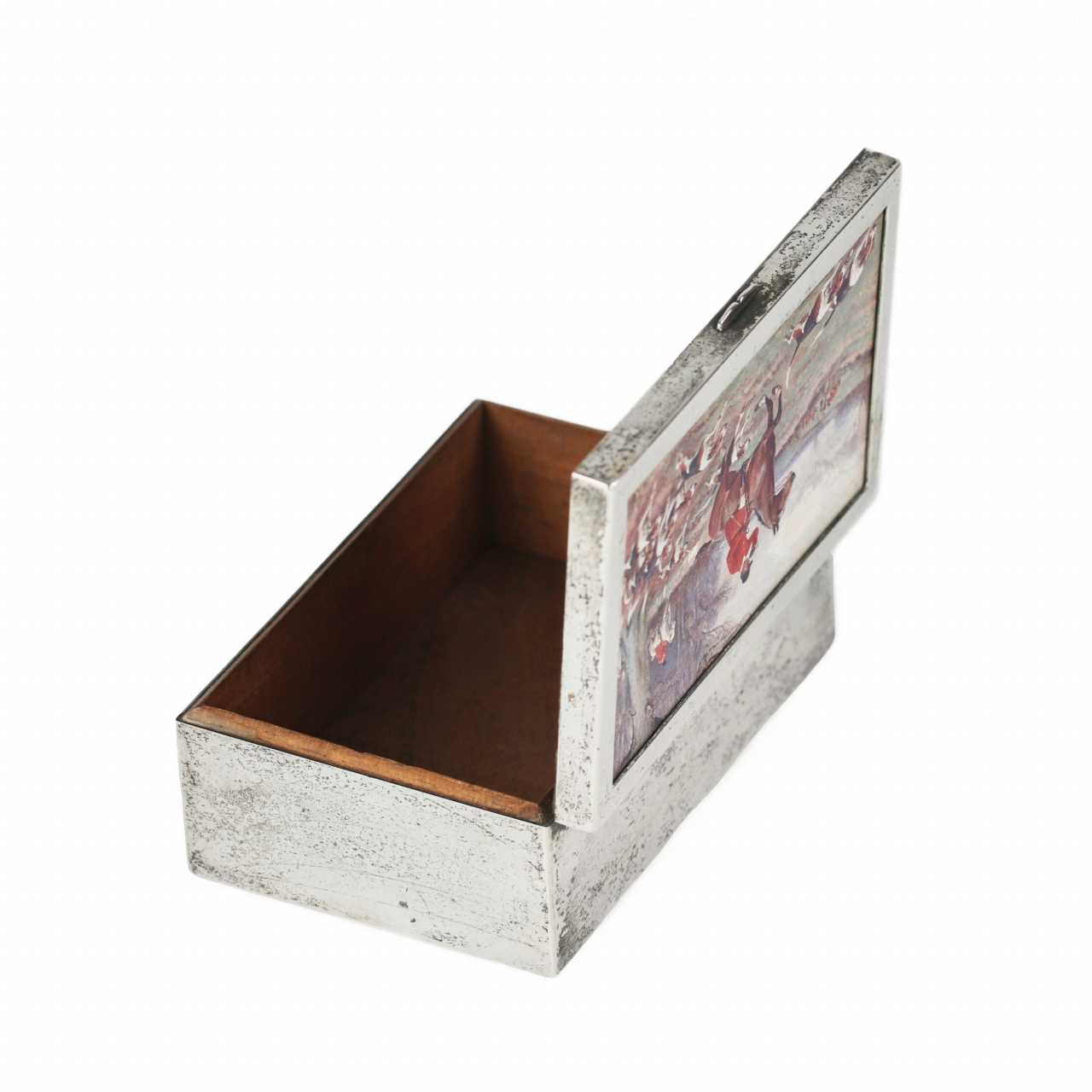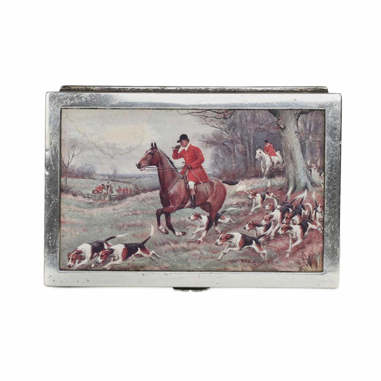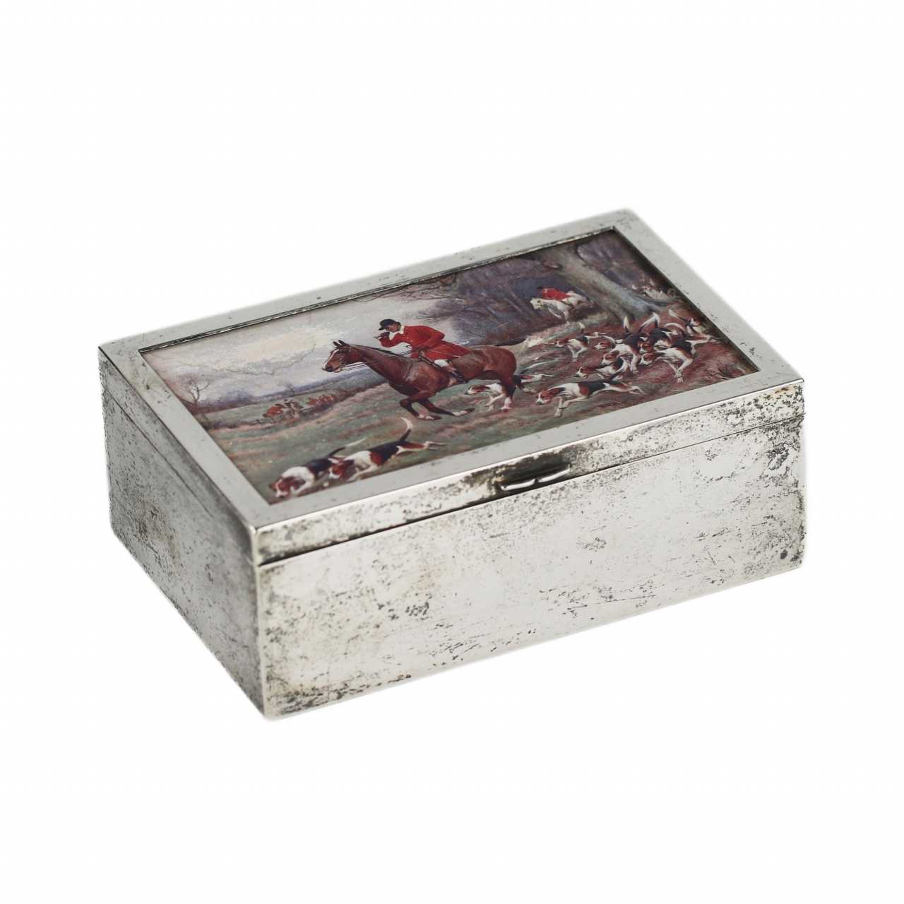 Une élégante boîte à cigares rectangulaire, réalisée dans l`esthétique du début du 20e siècle. Le corps est en métal argenté, ce qui confère à l`objet une brillance expressive et un caractère raffiné. L`intérieur est doublé de bois de poirier, très apprécié pour ses propriétés hygroscopiques et aromatiques, idéal pour stocker les produits du tabac. Le couvercle est décoré d`une scène de chasse à courre, réalisée dans l`esprit de la tradition de la chasse britannique. Matériaux : métal argenté, bois de poirier. Dimensions : 5 × 13,5 × 9,5 cm.