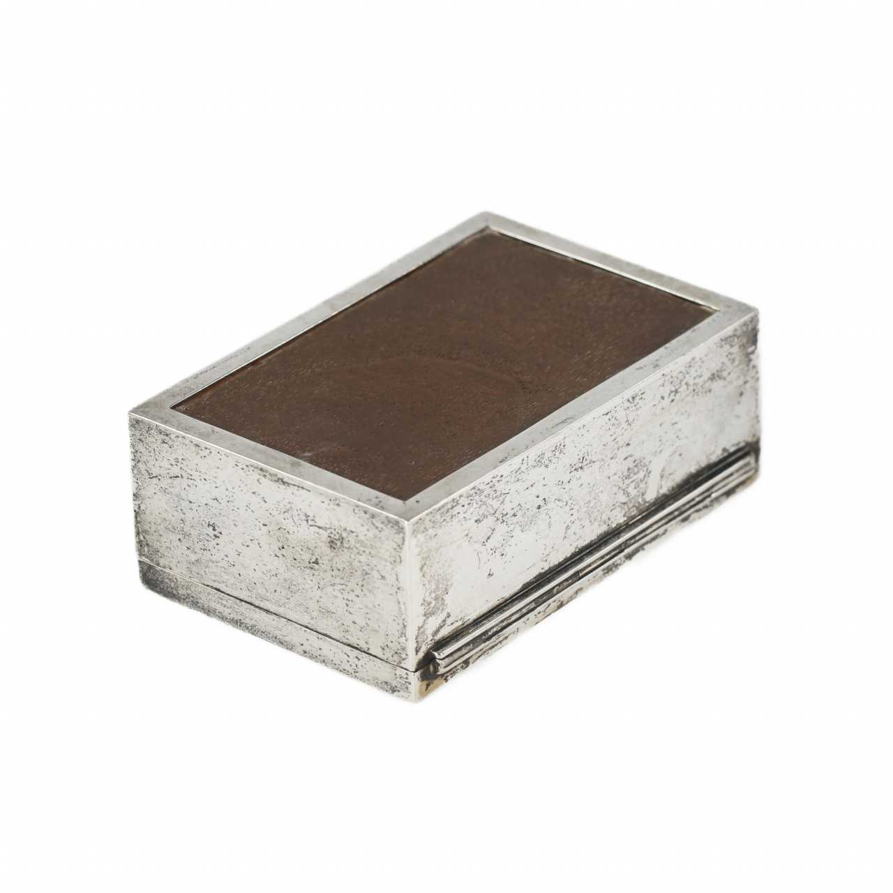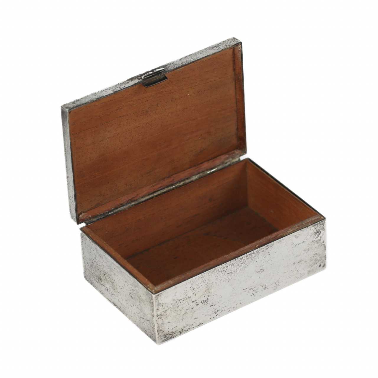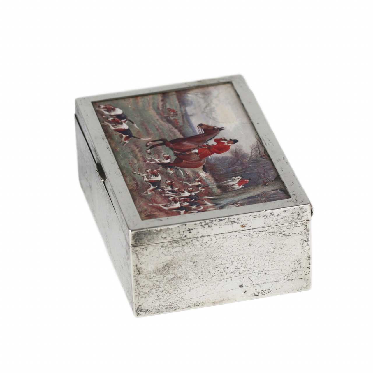 Une élégante boîte à cigares rectangulaire, réalisée dans l`esthétique du début du 20e siècle. Le corps est en métal argenté, ce qui confère à l`objet une brillance expressive et un caractère raffiné. L`intérieur est doublé de bois de poirier, très apprécié pour ses propriétés hygroscopiques et aromatiques, idéal pour stocker les produits du tabac. Le couvercle est décoré d`une scène de chasse à courre, réalisée dans l`esprit de la tradition de la chasse britannique. Matériaux : métal argenté, bois de poirier. Dimensions : 5 × 13,5 × 9,5 cm.