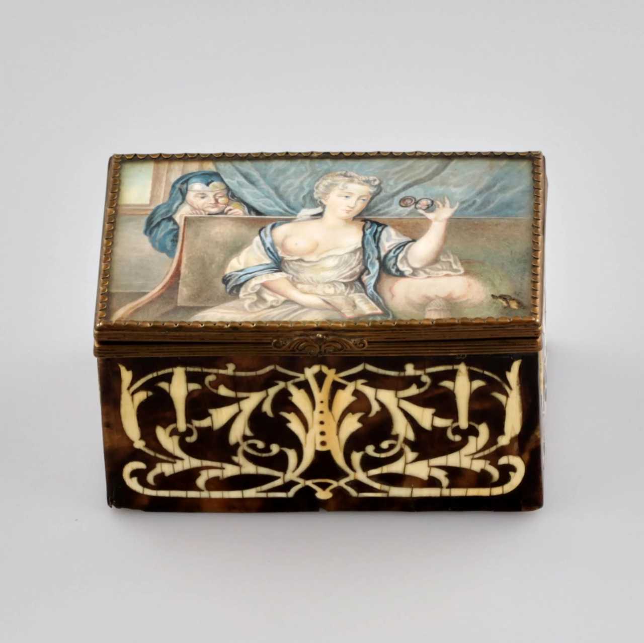 Boîte avec une scène erotique en tortue et ivoire. Une fille à la poitrine nue languit pour son amant avec un livre, sous la surveillance d`une religieuse à la loupe. Aquarelle sur l`os. Signature: Baumana? 19e siècle L. 12 cm. Hauteur 6,5 cm. B. 8 cm.
