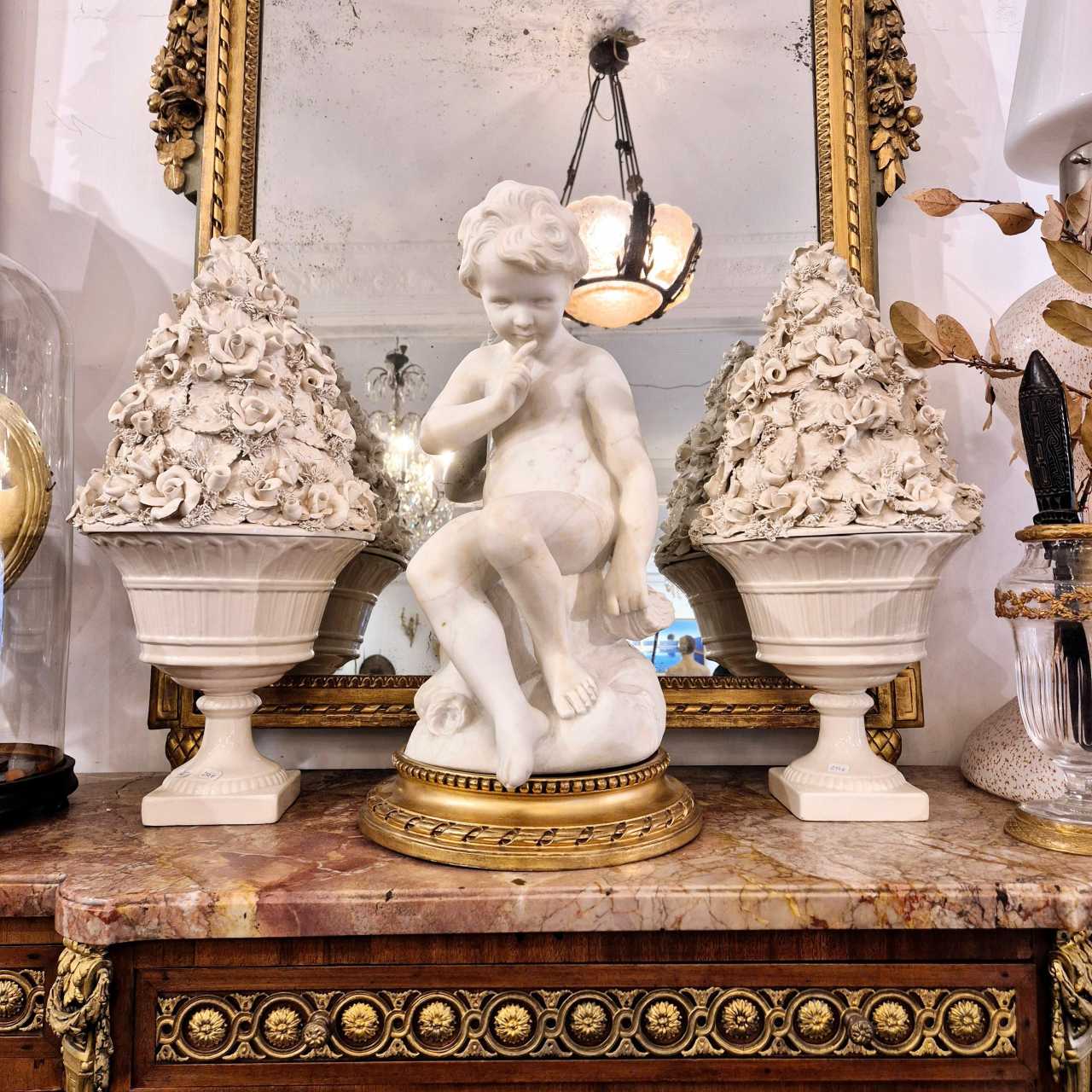 White marble sculpture of Cupid based on a work by Étienne Maurice Falconet (1716-1791), the original of which is in the Louvre Museum in Paris. It is presented on a gilded wooden base with a pearl stripe.Very fine craftsmanship and high quality for this 19th-century white veined Carrara marble statue of Cupid.Height with base: 59 cm.Weight: 30 kg.The original work, also known as “LAmour menaçant”, was commissioned by Mme de Pompadour, whose plaster model was exhibited at the Salon of 1755. The marble statue, presented at the Salon two years later, adorns the gardens of the Hôtel dÉvreux, the future Palais de lÉlysée, the Marquises Parisian residence. The iconography is that of Silent Love: seated on clouds, the mischievous Cupid asks for silence as he draws an arrow from his quiver.Born into a modest family in Paris, Étienne Maurice Falconet started out as a carpenters apprentice. However, his talent for wood and clay sculpture soon attracted the attention of Jean-Baptiste Lemoyne, who took him under his wing. For almost ten years, Falconet perfected his art in his masters workshop. Thanks to François Boucher, he became close to the Marquise de Pompadour, an influential patron of the arts and favorite of Louis XV, who commissioned several works from him, including La Jardinière, intended for the dairy of her Château de Crécy.His talent was recognized in 1754 with his sculpture Milon de Crotone, which earned him membership of the Académie royale de peinture et de sculpture. The works he exhibited at the Salons of 1755 and 1757, notably LAmour menaçant - commissioned by Madame de Pompadour - placed him among the most renowned sculptors of his time. This recognition opened the doors to the royal porcelain factory at Sèvres, where he directed the sculpture workshops between 1757 and 1766. He played a major role in the success of the “cookie de Sèvres”, porcelain sculptures left unglazed and undecorated, and created over 70 figure models, featuring both feminine and childlike forms.In 1766, recommended by Frédéric Melchior Grimm and Diderot, Falconet was invited to St. Petersburg by Catherine II of Russia. After Madame de Pompadours death, he accepted the offer and left his Parisian studio in the rue dAnjou - nicknamed “la chaumière” by Diderot. In Russia, he spent twelve years creating the Monument à Pierre le Grand, an imposing equestrian statue. However, tensions with the imperial court led him to leave the country for the United Provinces, before returning to France.Back in Paris, he was appointed rector of the Académie royale de peinture et de sculpture. Here, he produced several masterpieces, including Moïse et David pour léglise Saint-Roch, Les Mangeurs de raisins, La Leçon de flûte, Pygmalion, Alexandre, LHiver and La Mélancolie. In 1780, he was replaced by Charles-Antoine Bridan as professor of sculpture.Falconet was also a theorist of his art. He translated and annotated passages on painting and sculpture from Pliny the Elders Natural History, and wrote several works on the history of art in Antiquity and in his own time. Diderot entrusted him with writing the “Sculpture” article for LEncyclopédie. In 1761, he published his Réflexions sur la sculpture, followed by other writings in six volumes from 1781.