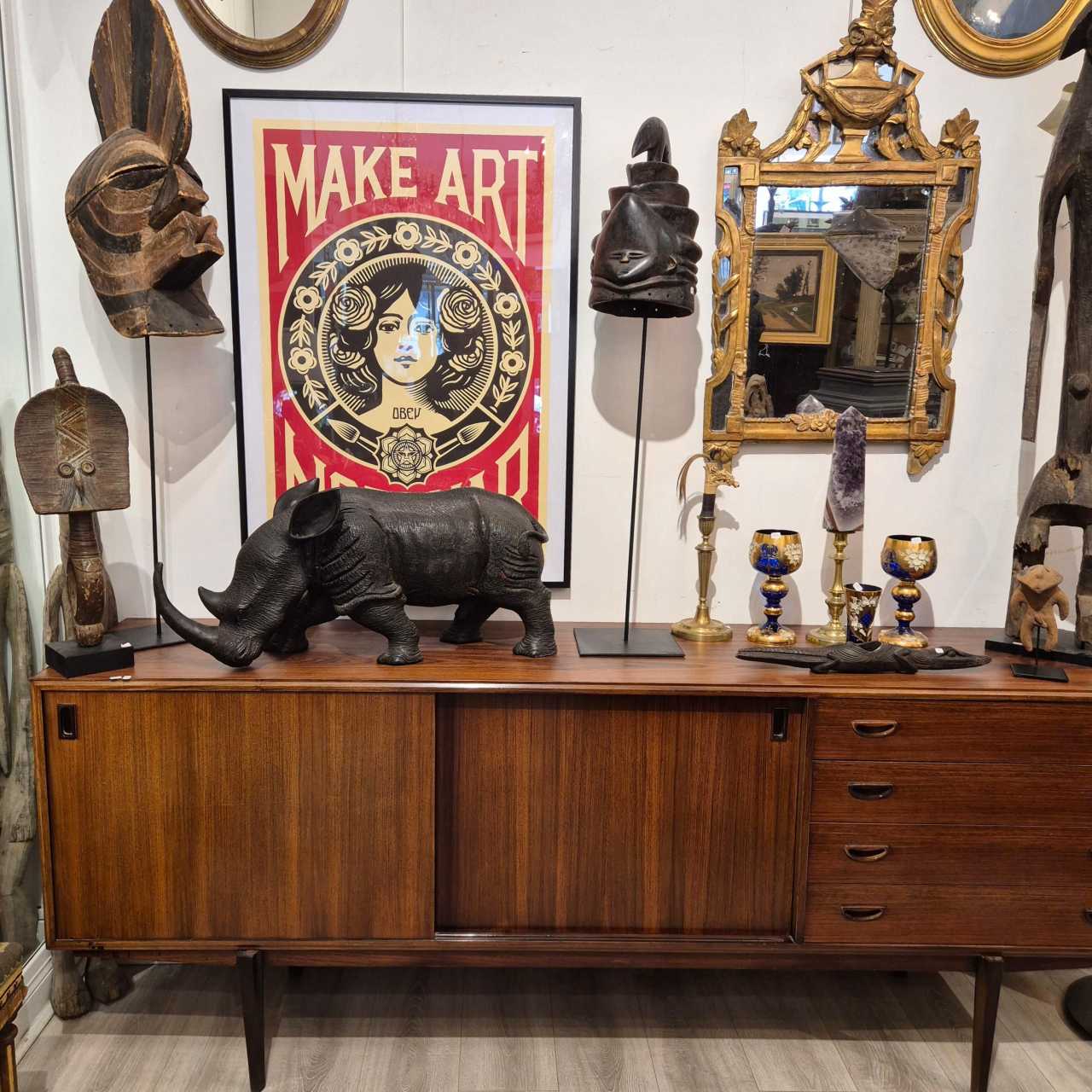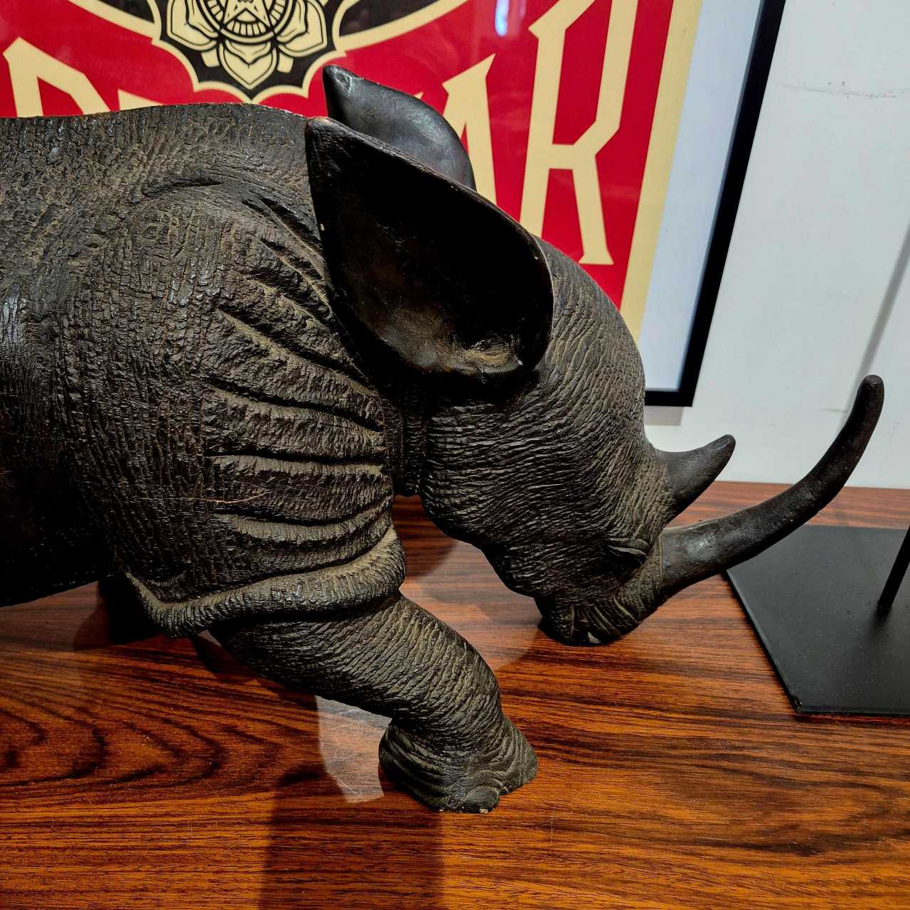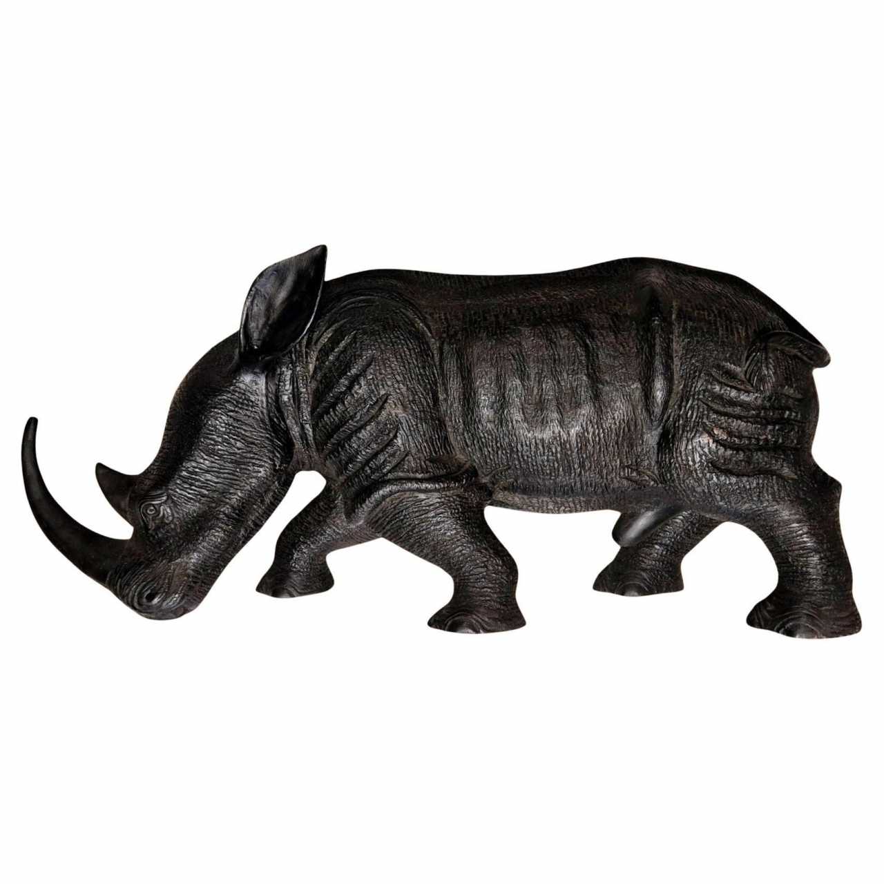Superbe rhinocéros en bois massif sculpté : le travail de sculpture est en effet admirable par sa finesse et l’attention portée aux détails ; il présente également une magnifique patine brillante et douce à certains endroits.Une pièce de caractère étonnante et originale qui convient pour un intérieur classique comme contemporain.