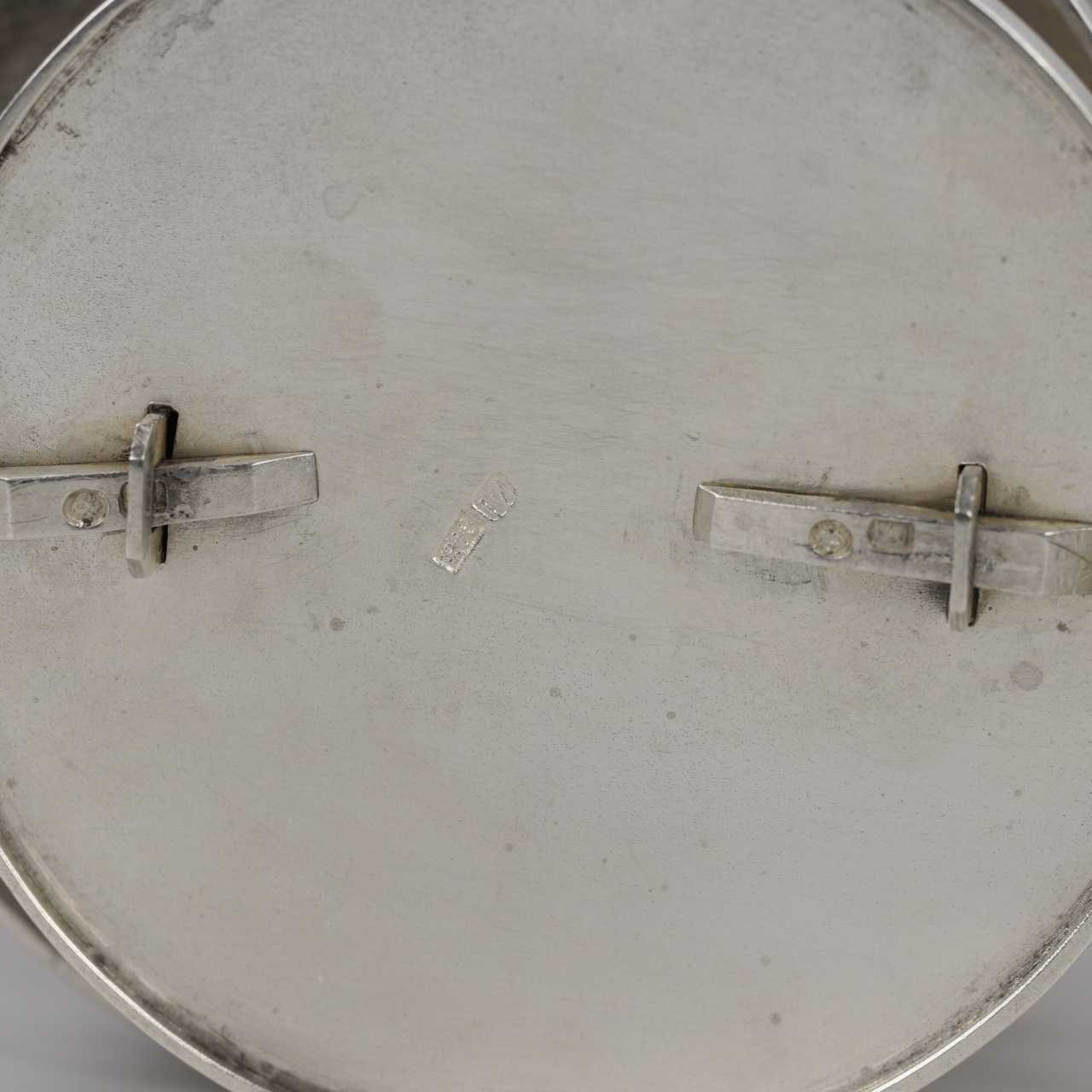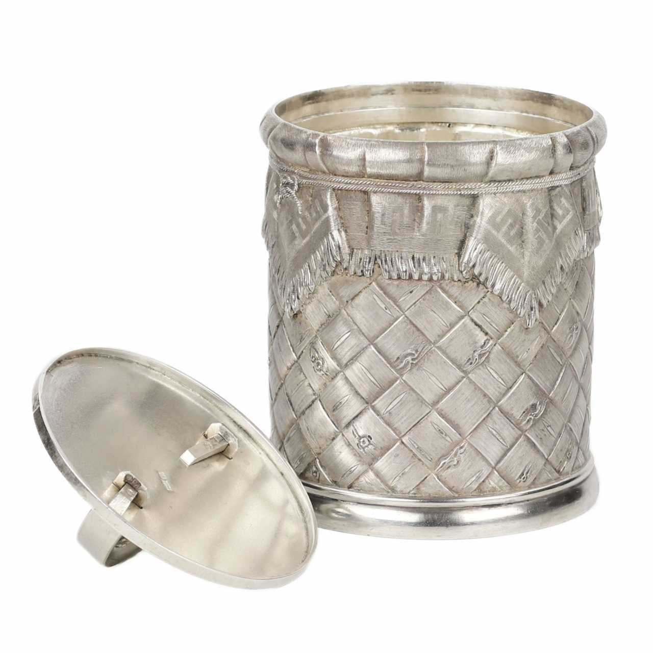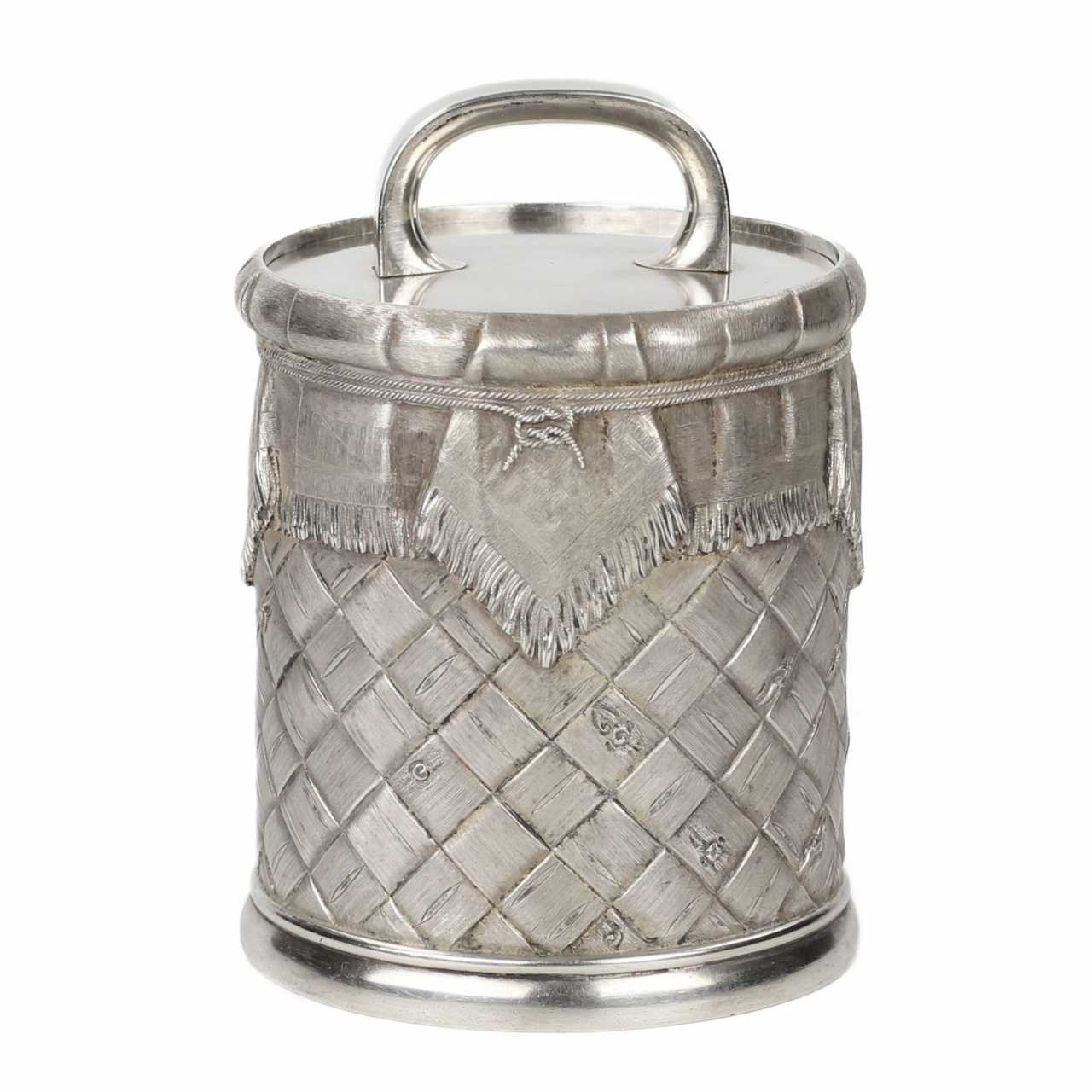 Un pot à caviar en argent réalisé en forme de boîte rustique avec un couvercle, imitant le tissage en relief à partir de liber. Le pot est décoré d`un trompe l`oeil réalisé sous la forme d`une serviette tissée nouée par une corde tressée. La serviette est décorée d`un motif géométrique en relief imitant une broderie à la russe sur tissu. Les bords de la serviette sont décorés de franges. Argent, estampage, gaufrage, gaufrage, gravure. Empire russe, Moscou. 1892 Marques : marque de maître sous la forme des lettres GL dans un écu carré. - Lizerin Girshi Gaselevich, marque d`analyse sous forme de fraction dont le numérateur est les lettres A.S, et le dénominateur est l`année d`analyse - 1892 ; étalon argent - 84 dans un bouclier carré ; index du Bureau d`analyse de Moscou sous la forme d`une image de Saint Georges le Victorieux sur un cheval (orienté vers la gauche) dans un bouclier figuré. Maître d`analyse - Smirnov Alexander Alekseevich. Dimensions : hauteur -14,5 cm, Poids 403 g.
