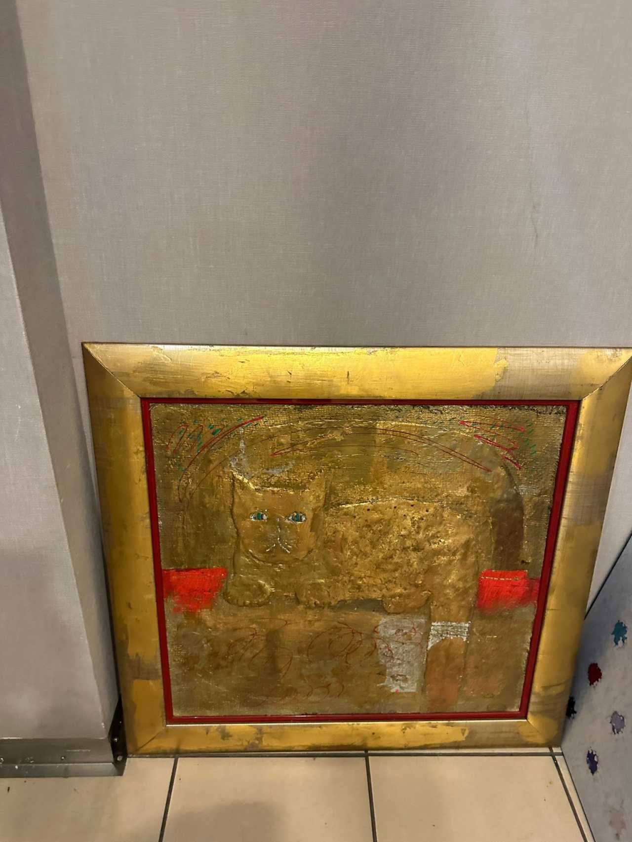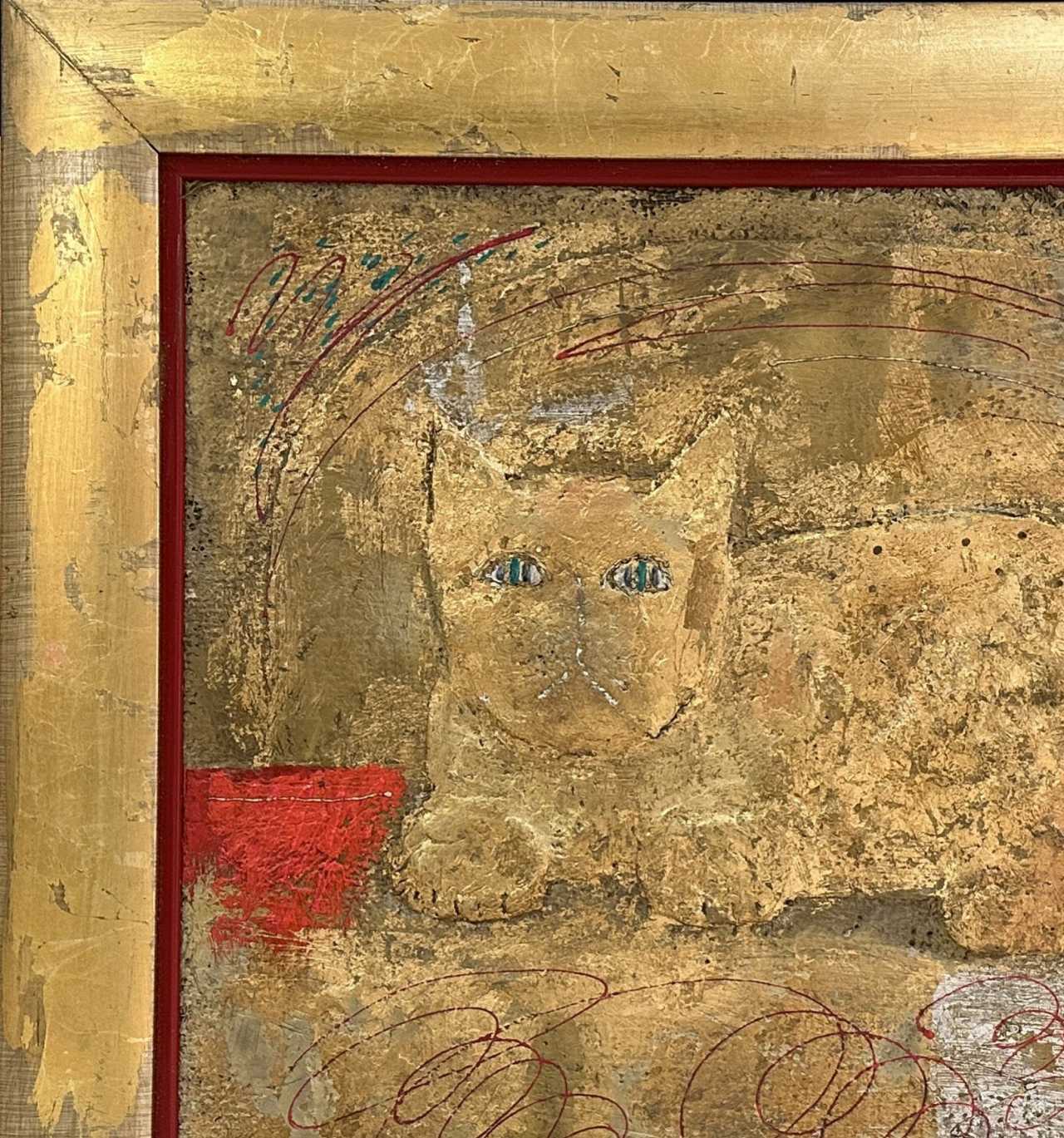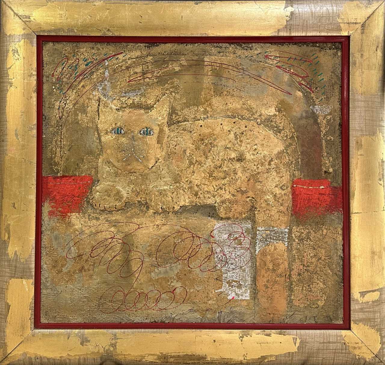 Auteur : Dina Dubina, Chat au repos, technique d&39;auteur, taille : 54 x 56 cm, taille encadrée : 70 x 72 cm année 2012