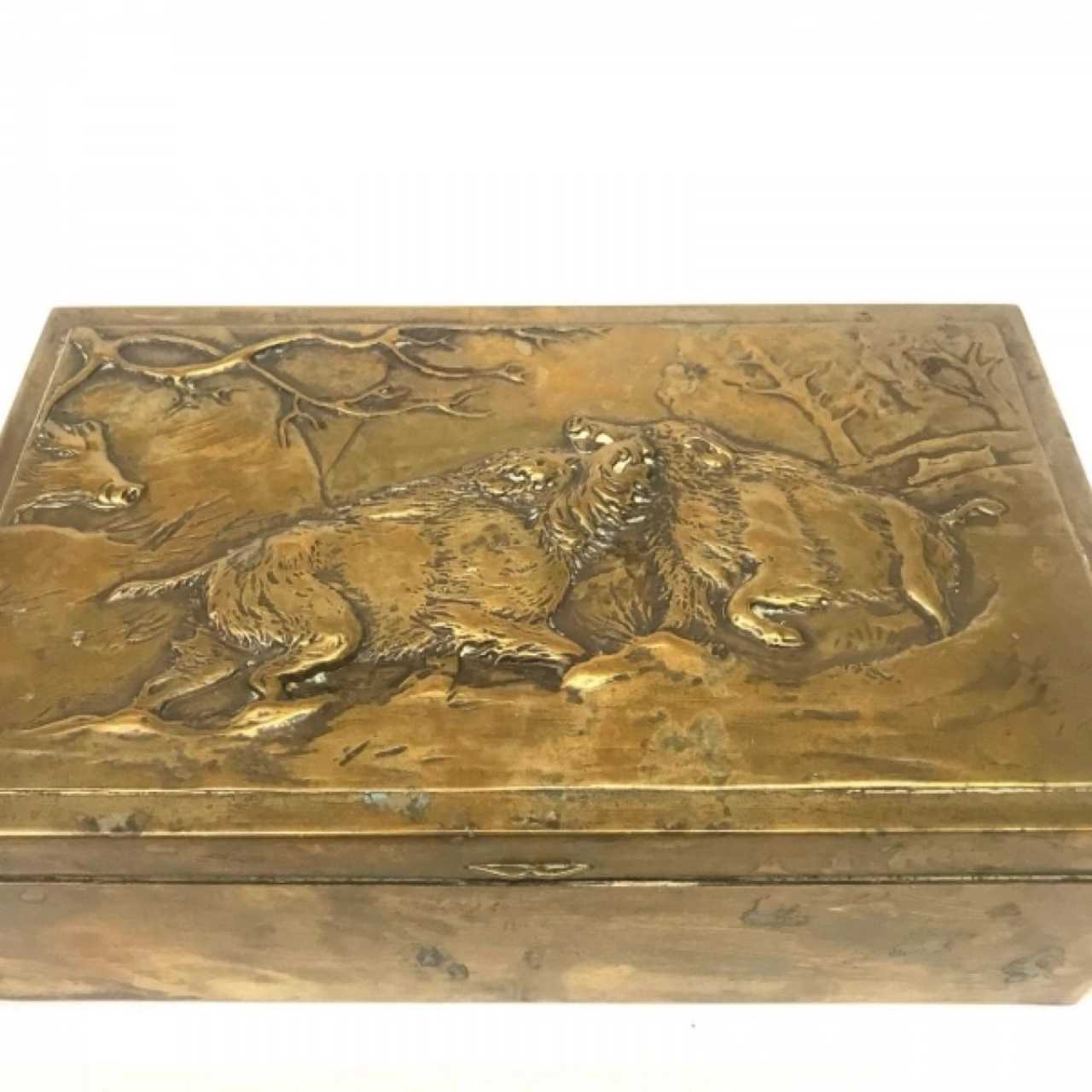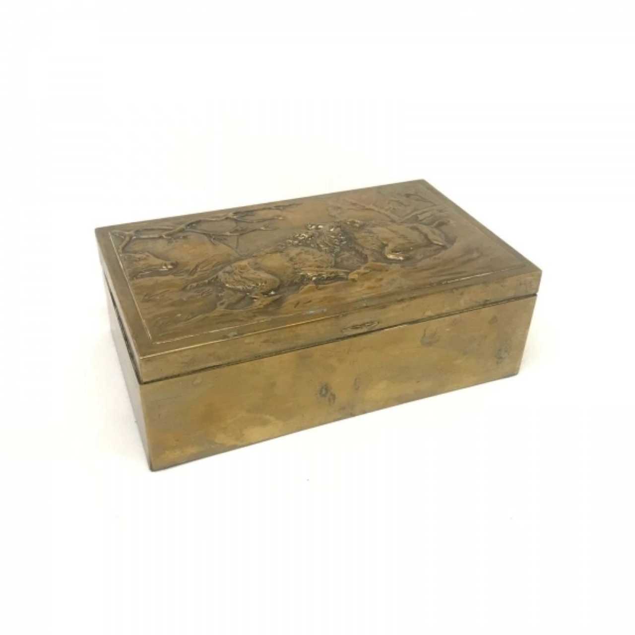 Coffret Chasse, decore dun motif cisele representant un combat de sangliers sous un chêne.7x21.5x13cm.