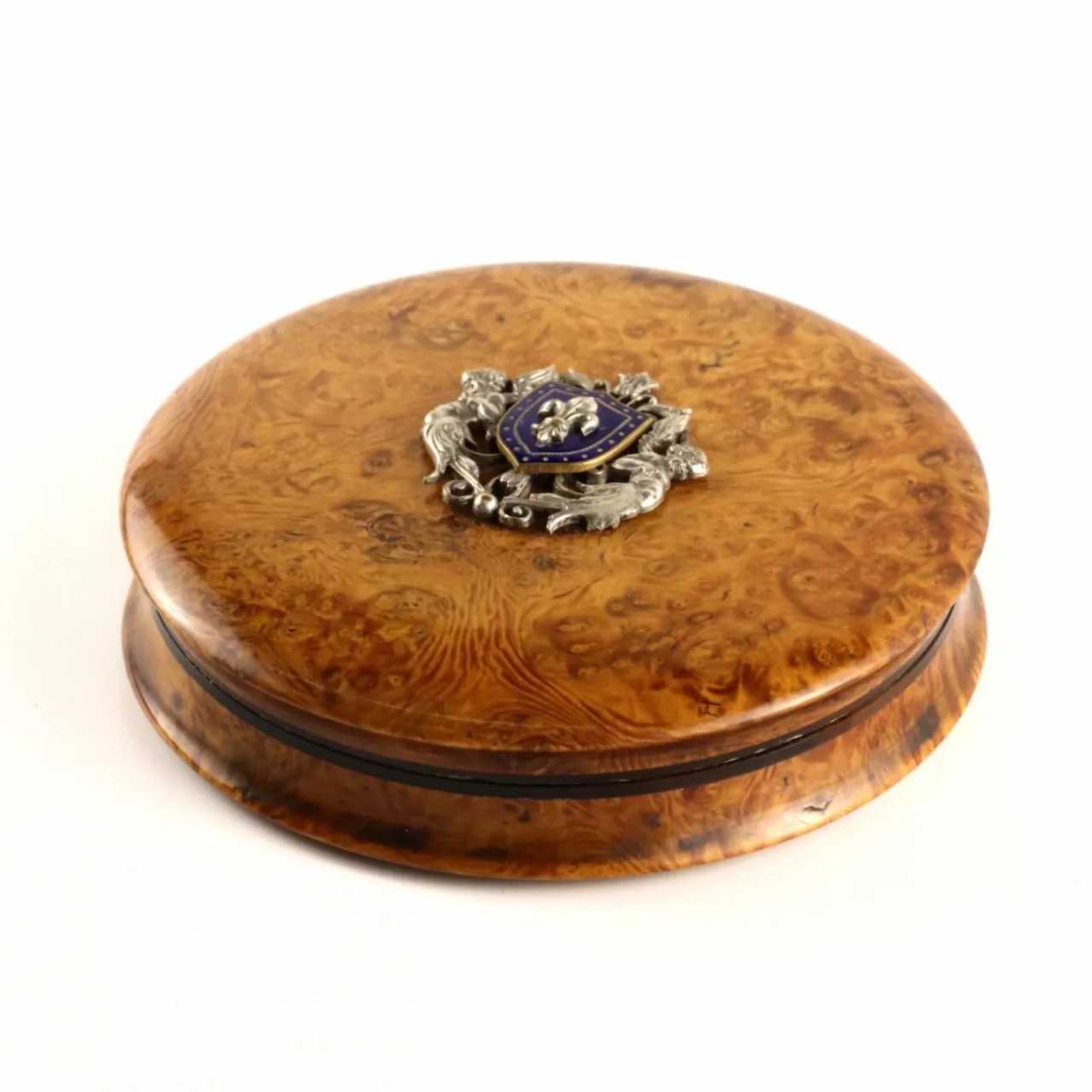 Boîte ronde en bouleau ondule et ecaille de tortue , avec un blason en argent et un lys royal sur l`email bleu de l`ecu. D-9cm. France XIXe siècle.