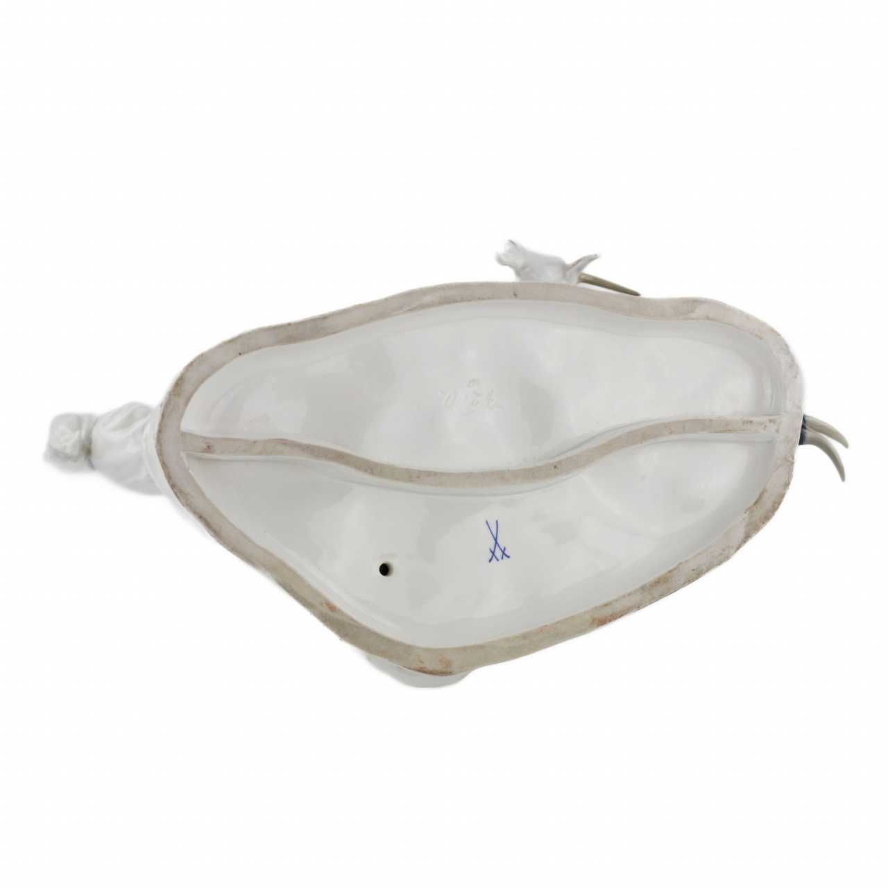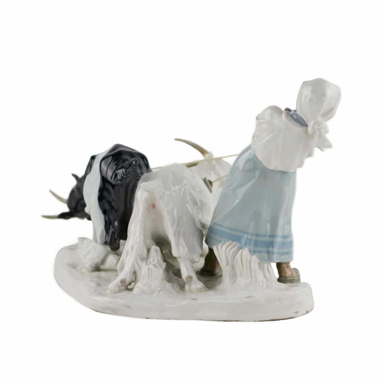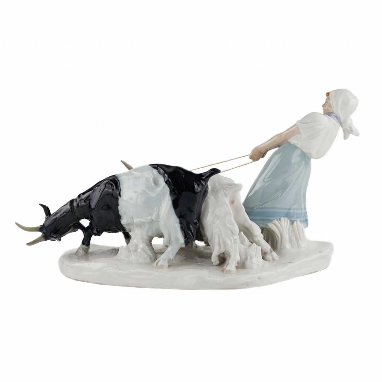 Composition en porcelaine Bergère aux chèvres. Meissen, années 1920. Lauteur du modèle est Pilz, Otto (1876, Sonneberg - Dresde, 1934). Une expérience dune manufacture de renommée mondiale en matière de style Art Nouveau, de plasticité et de couleur. Il transmet de manière crédible les mouvements multi-vecteurs des trois personnages dans une palette de couleurs sobre, soulignant la nature sculpturale du groupe. Marque : Timbre Meissen Crossed Swords, 1850-1924. 1ère année. Hauteur : 23 cm Longueur : 38 cm.