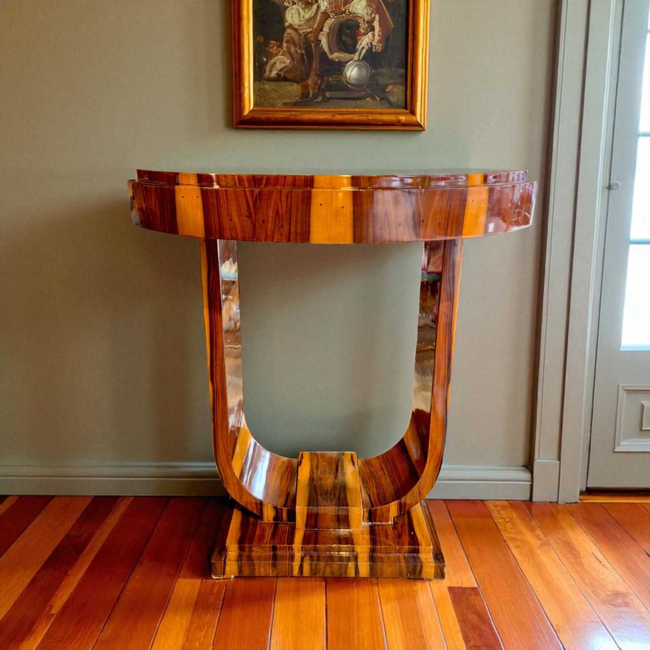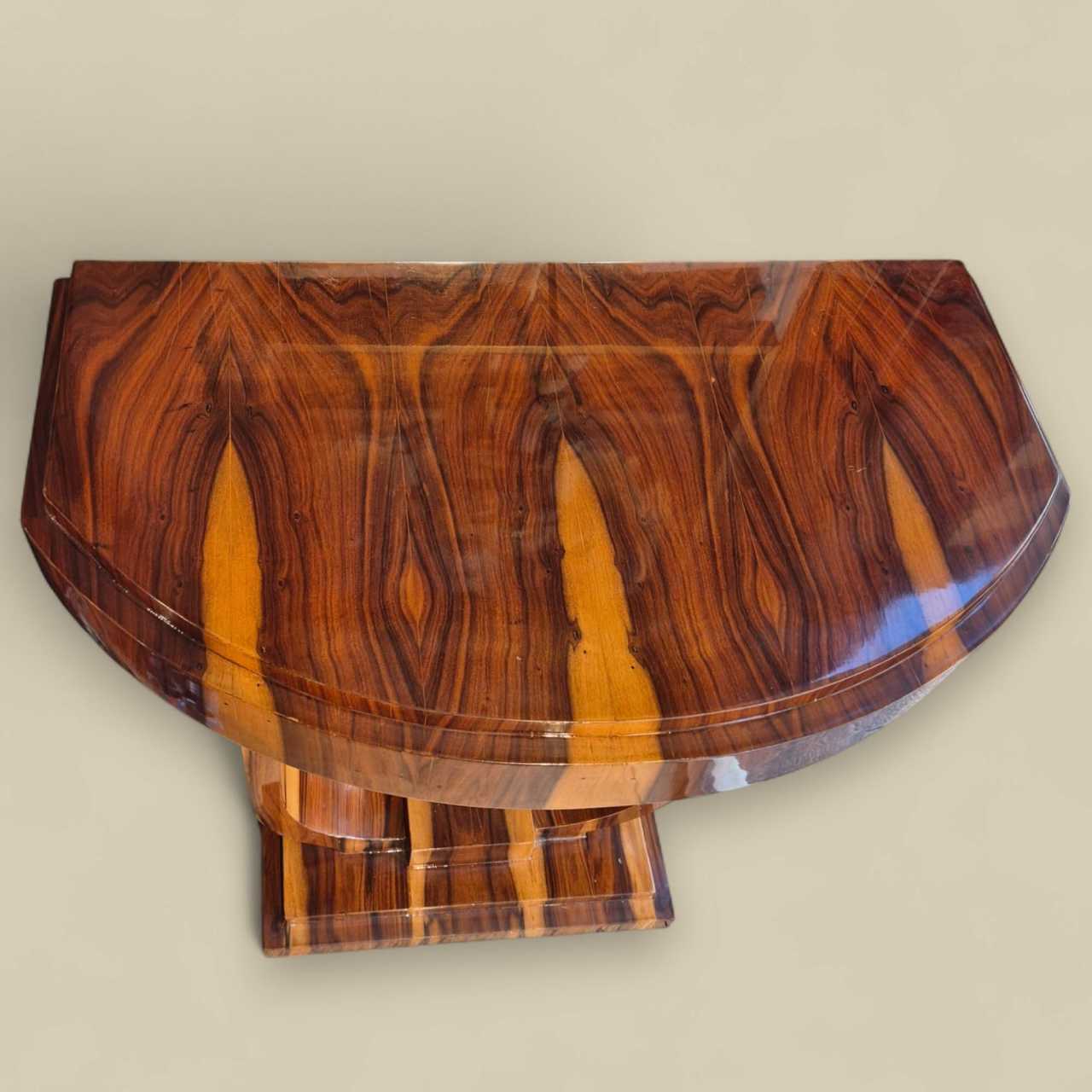 Console de style Art Déco, réalisée en placage de bois exotique, probablement du palissandre ou du palissandre, soigneusement sélectionné pour son veinage spectaculaire et son contraste naturel. Cette pièce présente une structure architecturale typique du mouvement Art Déco, avec des lignes géométriques audacieuses et une élégante symétrie. Son piètement en U inversé repose sur un socle à plusieurs niveaux, conférant à l&39;ensemble une allure sculpturale et équilibrée. Le plateau en demi-lune est souligné par un bord discret et raffiné, parfaitement intégré au design général. La finition brillante sublime la richesse du bois et témoigne d&39;un savoir-faire méticuleux, probablement réalisé au vernis au tampon, comme c&39;était courant à l&39;époque. Cette pièce incarne l&39;esprit du luxe discret et met en valeur le savoir-faire raffiné des années 1930. Idéale dans une entrée, un salon ou un couloir, elle apportera une touche d&39;élégance intemporelle à tout intérieur classique ou contemporain.