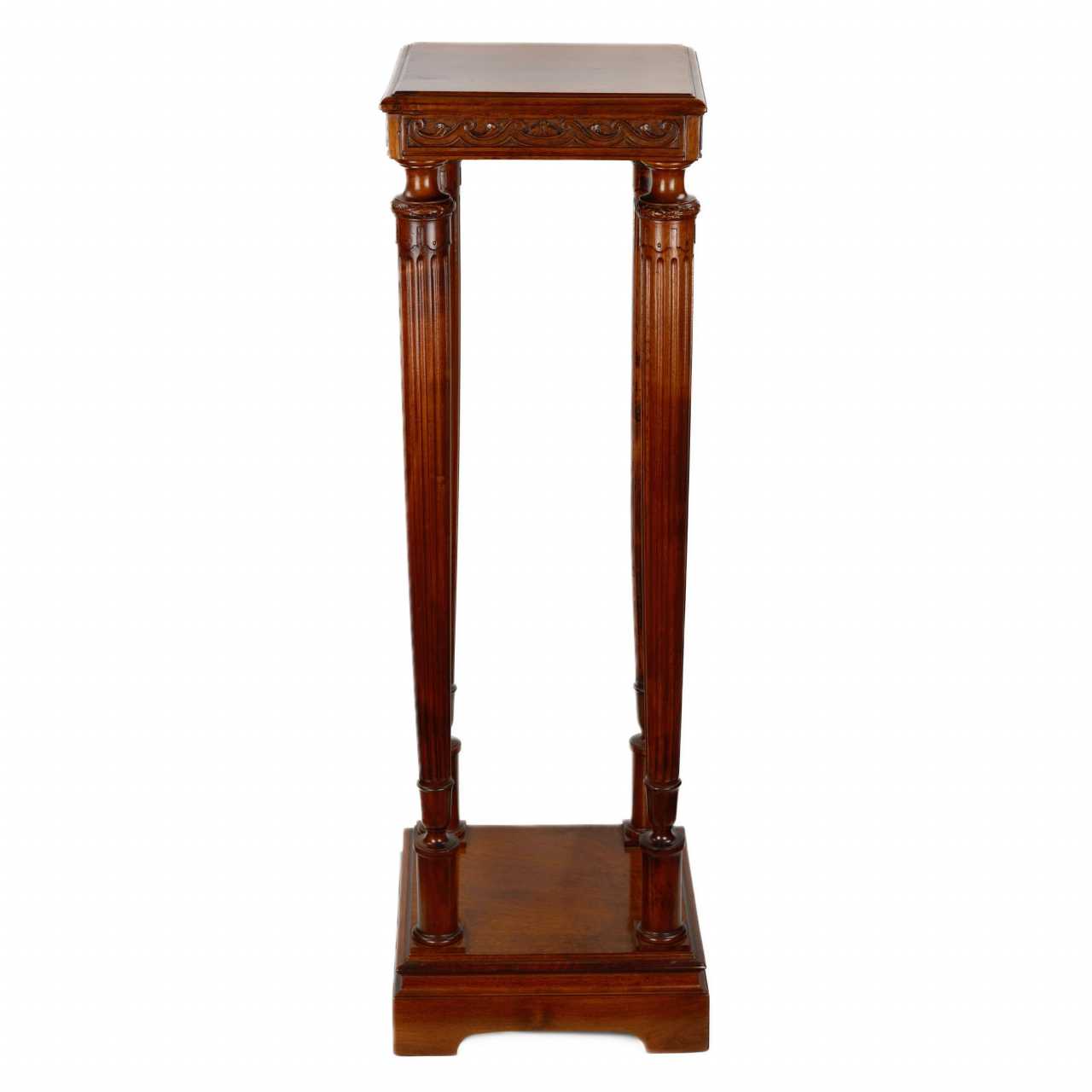 Console en bois de noyer massif sur quatre colonnes avec bases et piedestal art deco complexes. Porte un panneau carre avec un motif de vagues. Dimensions : 110x33x33cm. Debut du 20ème siècle.