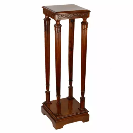 Console en bois de noyer massif sur quatre colonnes avec bases et piedestal art deco complexes. Porte un panneau carre avec un motif de vagues. Dimensions : 110x33x33cm. Debut du 20ème siècle.