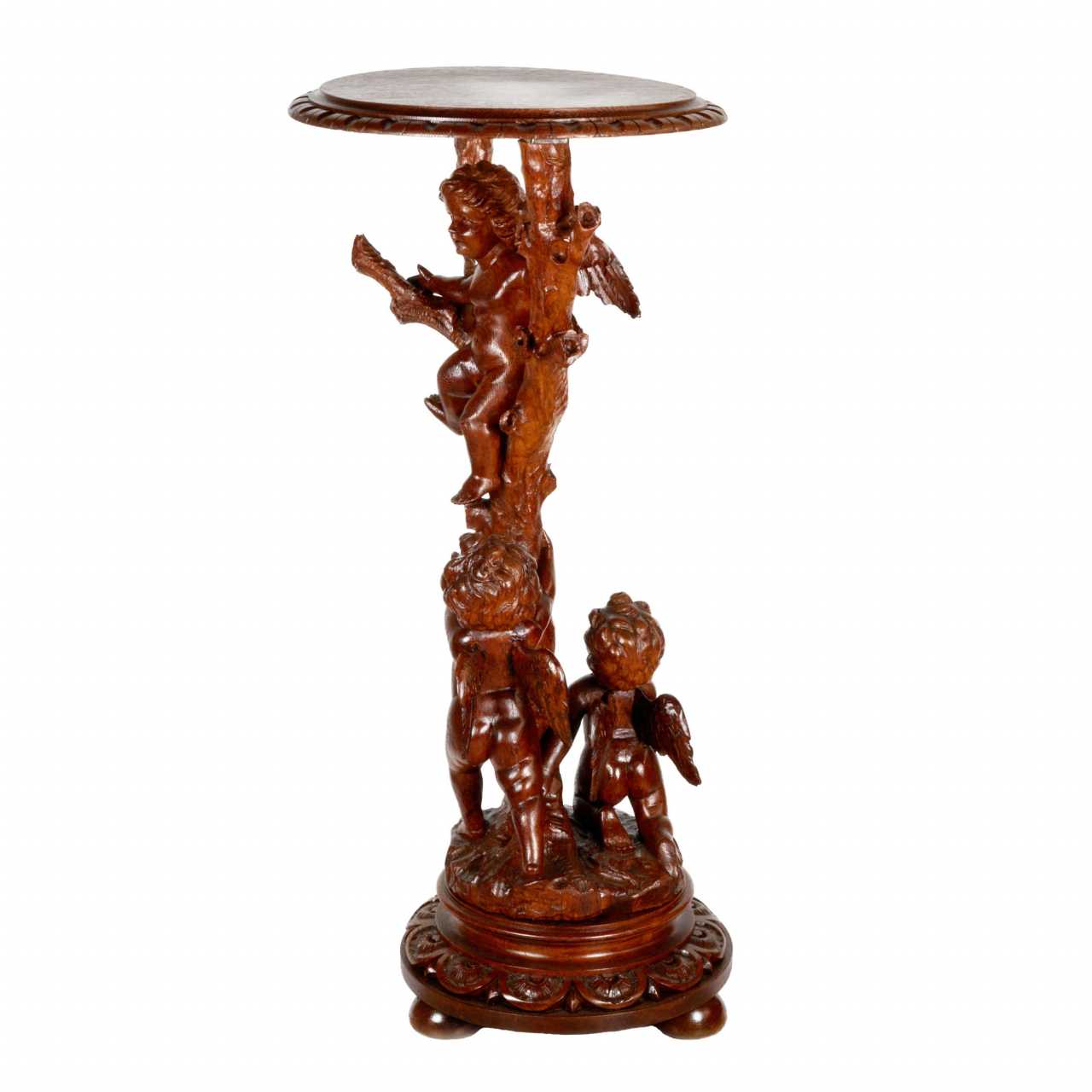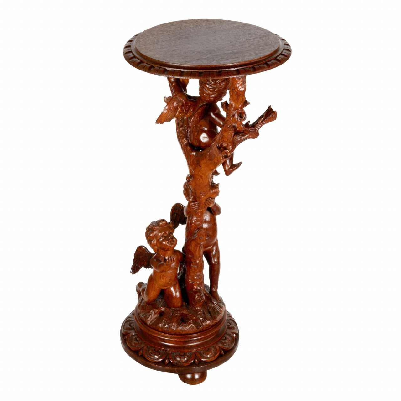 Console en bois sculpte damours gambadant sur larbre. Ils forment un support original pour le plateau dont les bords et les bases sont decores dans le style Non-Renaissance. Sculpture sur bois convaincante, tridimensionnelle et ludique du 19e siècle.