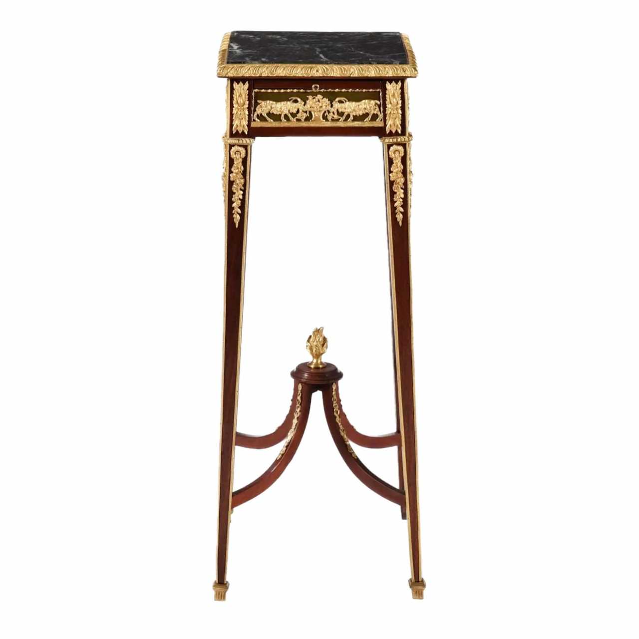 Console française du tournant des XIXème et XXème siècles en acajou et bronze dore, dans le goût de FRANCOIS LINKE. Hauteur : 87,5 cm Plateau de table 35 x 35 cm Les chèvres mangeant les raisins des paniers sont la base parcellaire du decor. Et aussi, riche en texture et motif, ceintures et vignettes.