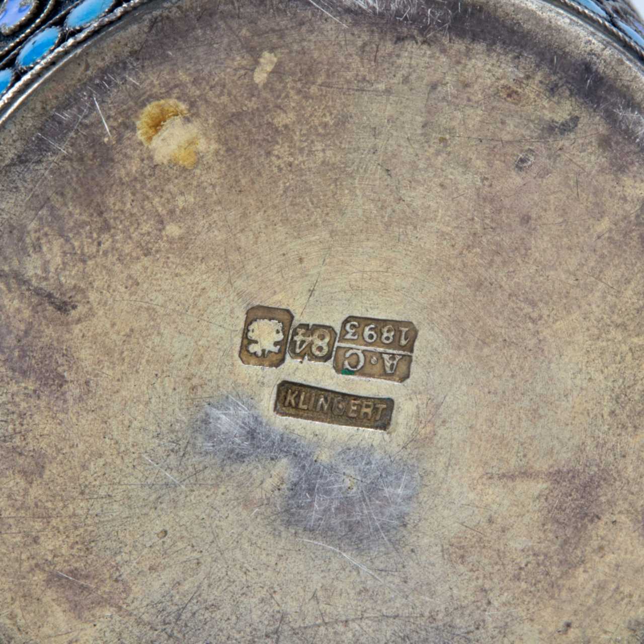 Le produit d`un grand artisan. Coupe en argent russe decoree d`emaux cloisonnes. Poinçons : Gustav Gustavovitch Klingert. Maître d`essai Alexander Alekseevich Smirnov, ne en 1893, Moscou. 84 echantillon d`argent. Poids 82 grammes Hauteur 6,7 cm.