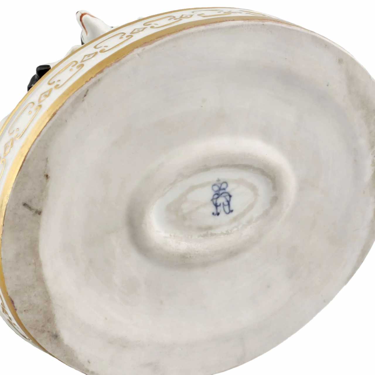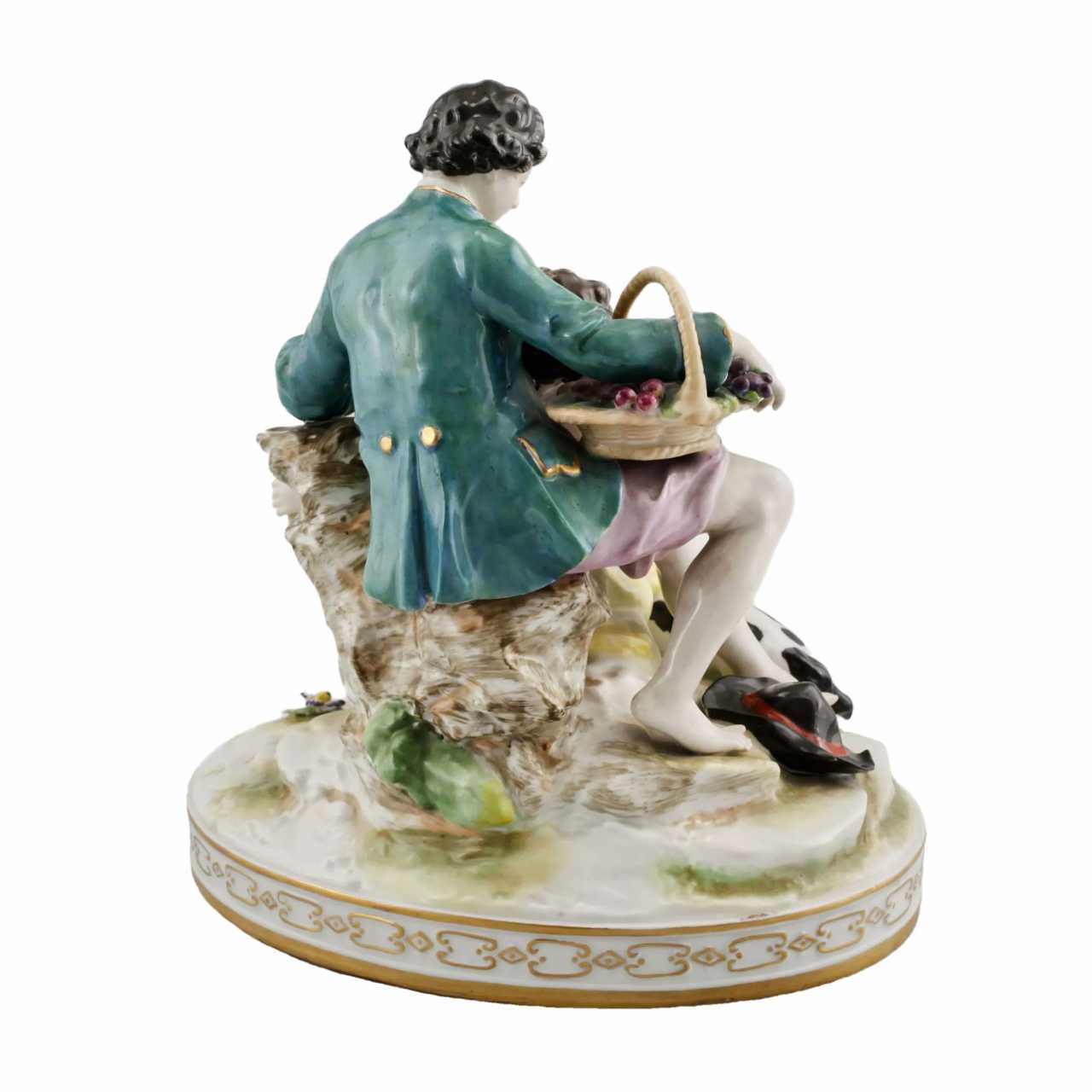 Porcelaine pastorale Couple romantique , dediee à la date du jardinier et de la bergère. Enlaces de façon pittoresque les uns sur les autres, le jeune homme regale sa bien-aimee de raisins, et elle, en gage de consentement et de reciprocite de sentiments mûrs, tient les baies sur ses genoux. Le chien, symbole de protection et de chastete, s`est habitue aux frequentations et ne suit pas la maîtresse. Marque du fabricant Aelteste Volkstedter Porzellanfabrik. H-23cm.