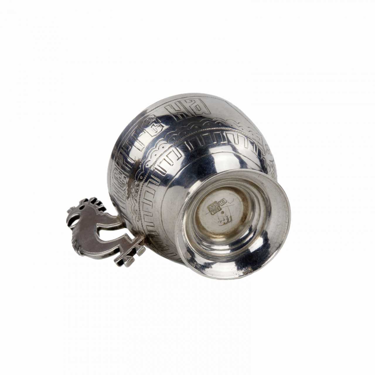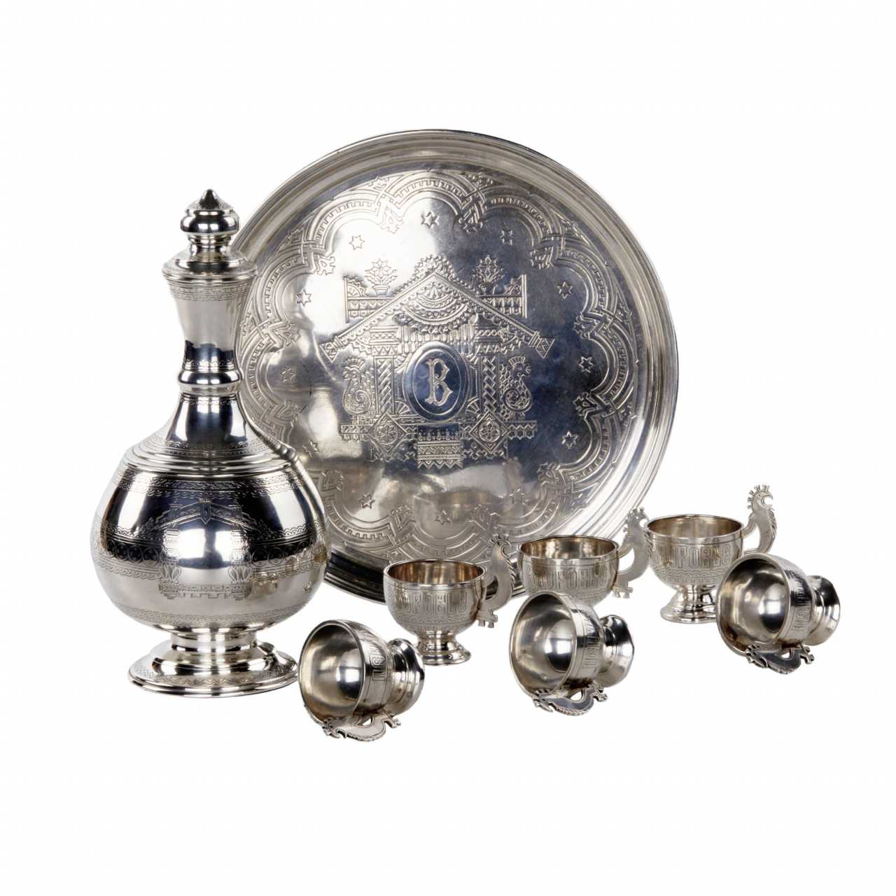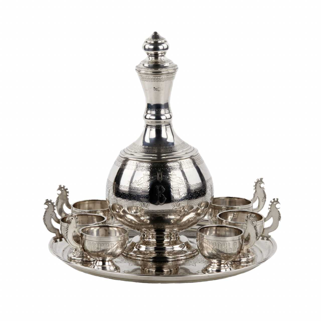 Elegant service à vodka de style neo-russe en argent, avec une carafe et six pieds sur un plateau. Le motif original de coqs sculptes sur les poignees est entrelace avec le motif grave fantaisiste des plateaux sur la carafe et le plateau. Le lunettes sont en outre decores du slogan Buvez à votre sante. Poinçons de Moscou en argent 84 echantillons, 1881. Maître d`essai AK. Maître fabricant de SI, probablement S.M. Ikonnikov, orfèvre, 1860-1882. Poids total du service : 888 gr.