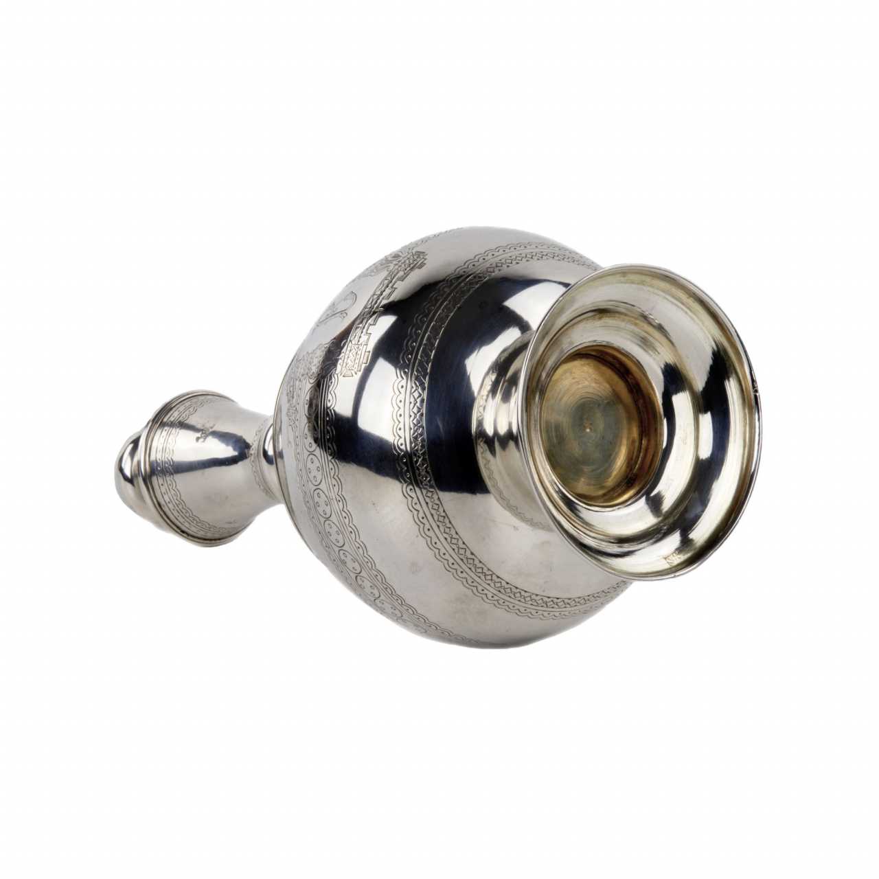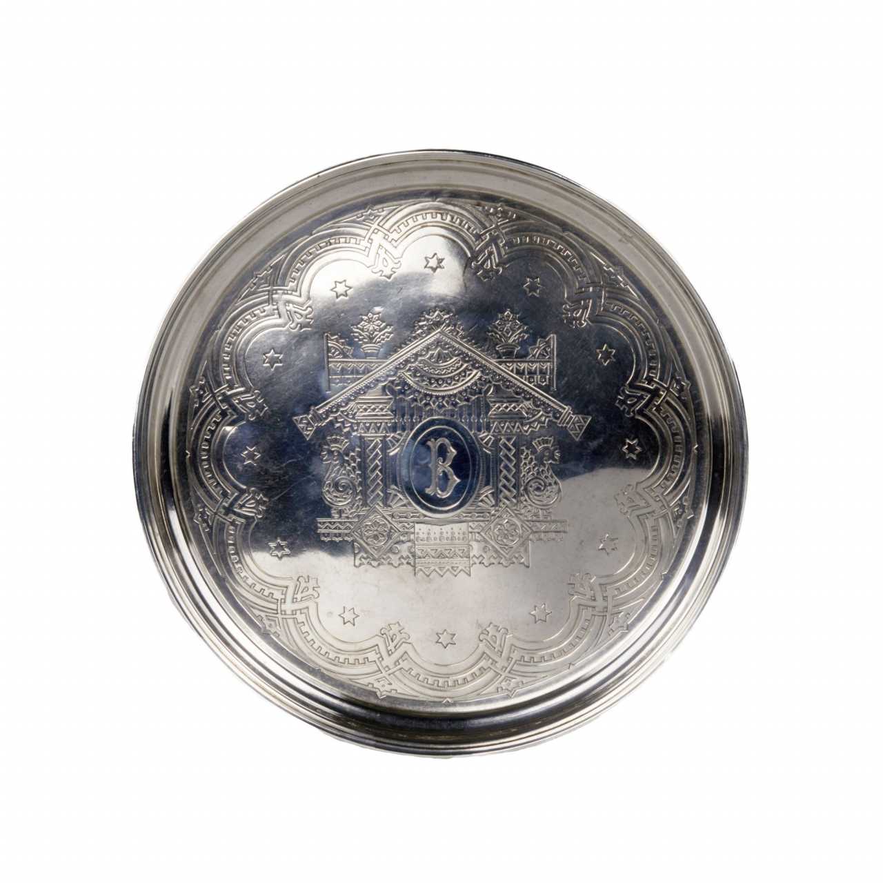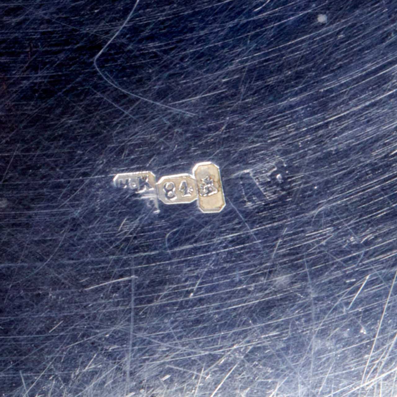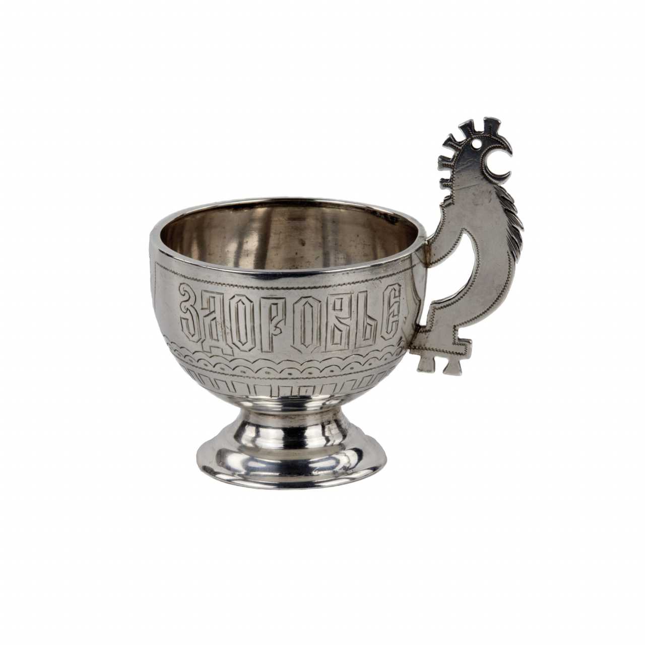 Elegant service à vodka de style neo-russe en argent, avec une carafe et six pieds sur un plateau. Le motif original de coqs sculptes sur les poignees est entrelace avec le motif grave fantaisiste des plateaux sur la carafe et le plateau. Le lunettes sont en outre decores du slogan Buvez à votre sante. Poinçons de Moscou en argent 84 echantillons, 1881. Maître d`essai AK. Maître fabricant de SI, probablement S.M. Ikonnikov, orfèvre, 1860-1882. Poids total du service : 888 gr.