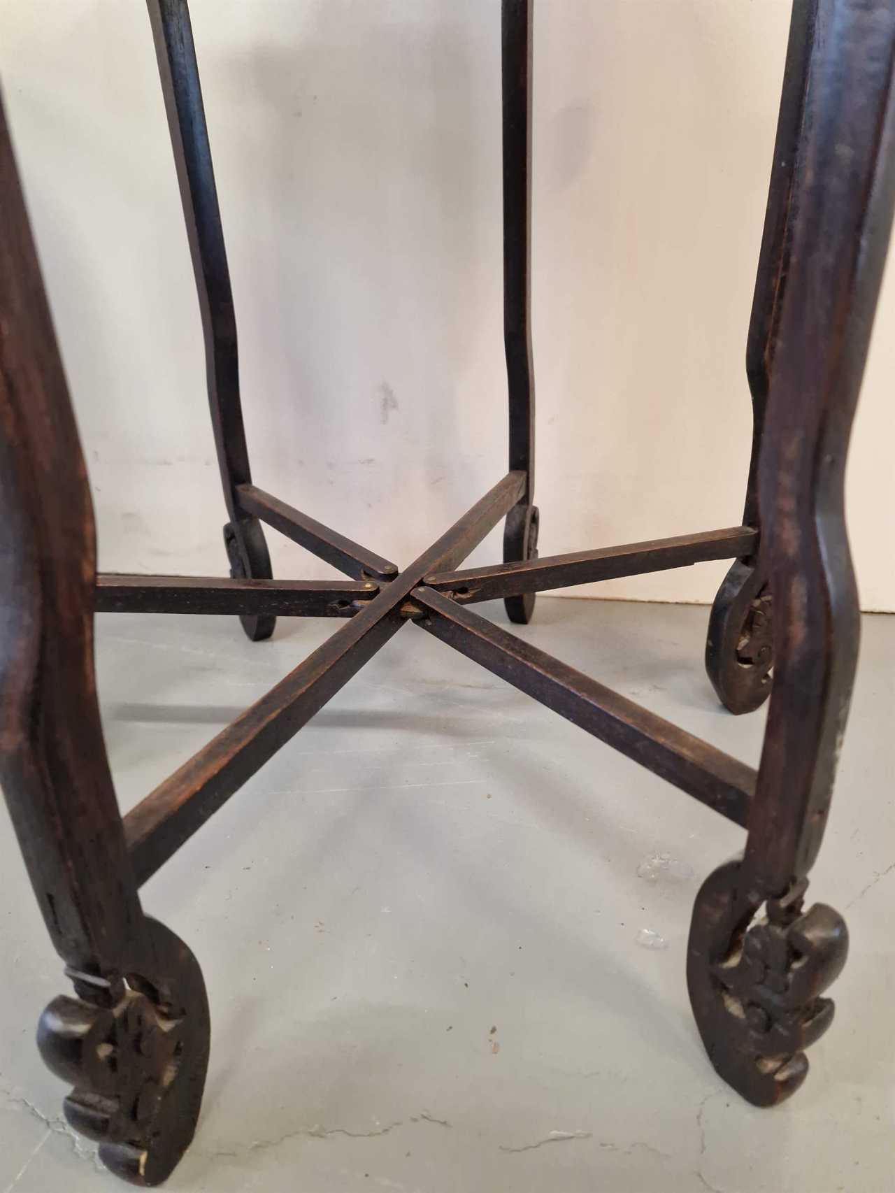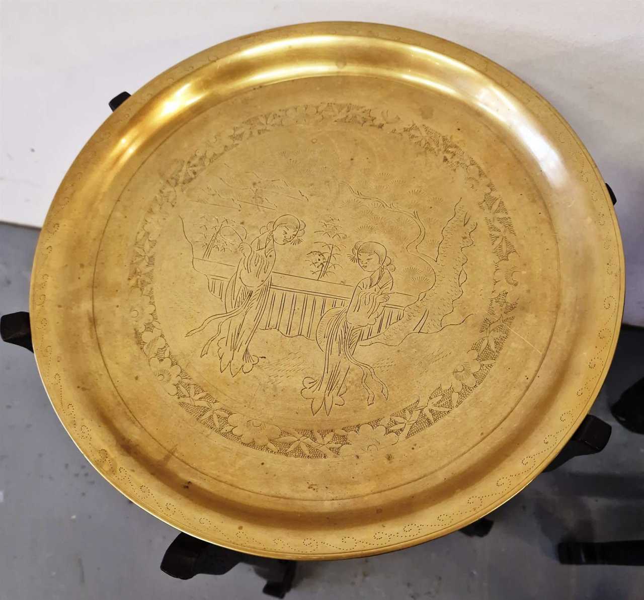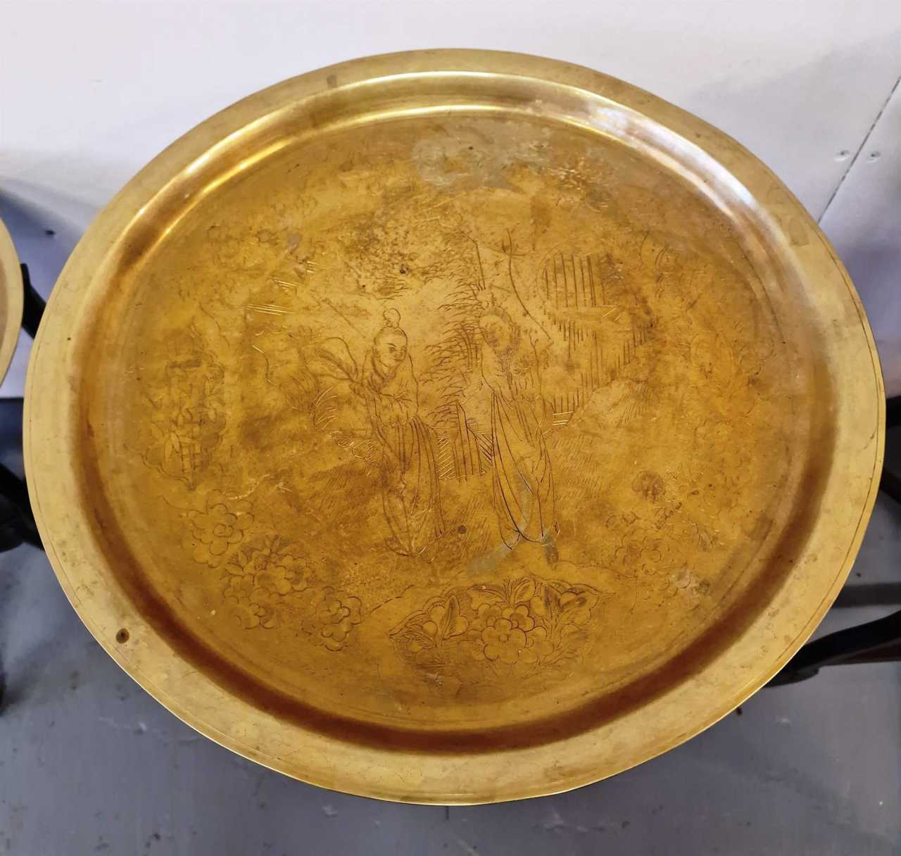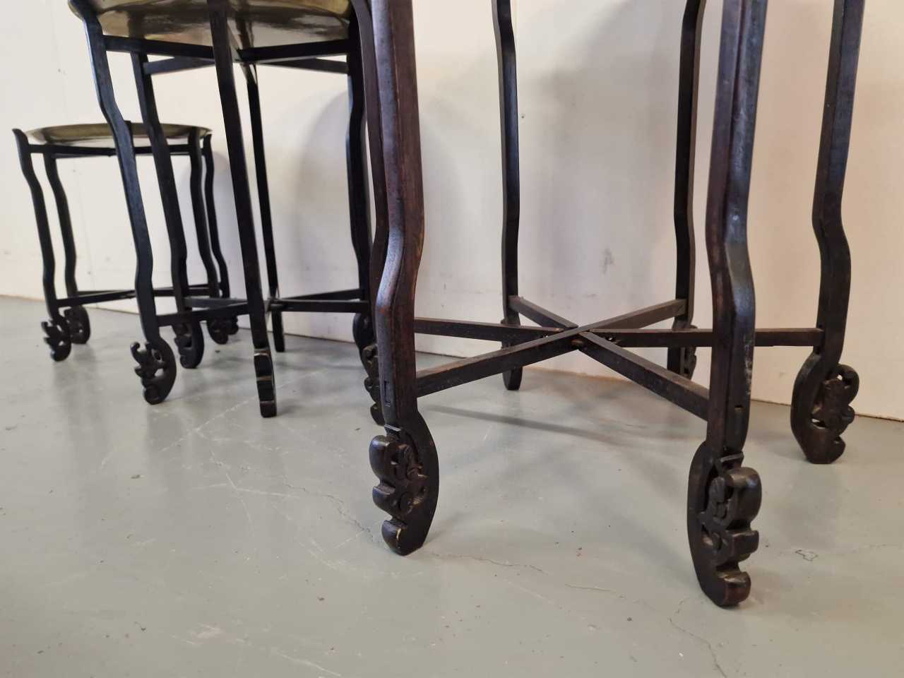 Set of 3 oriental style tables.Wood, brass.China.1950s.Largest table size: height 58cm; diameter 46cm