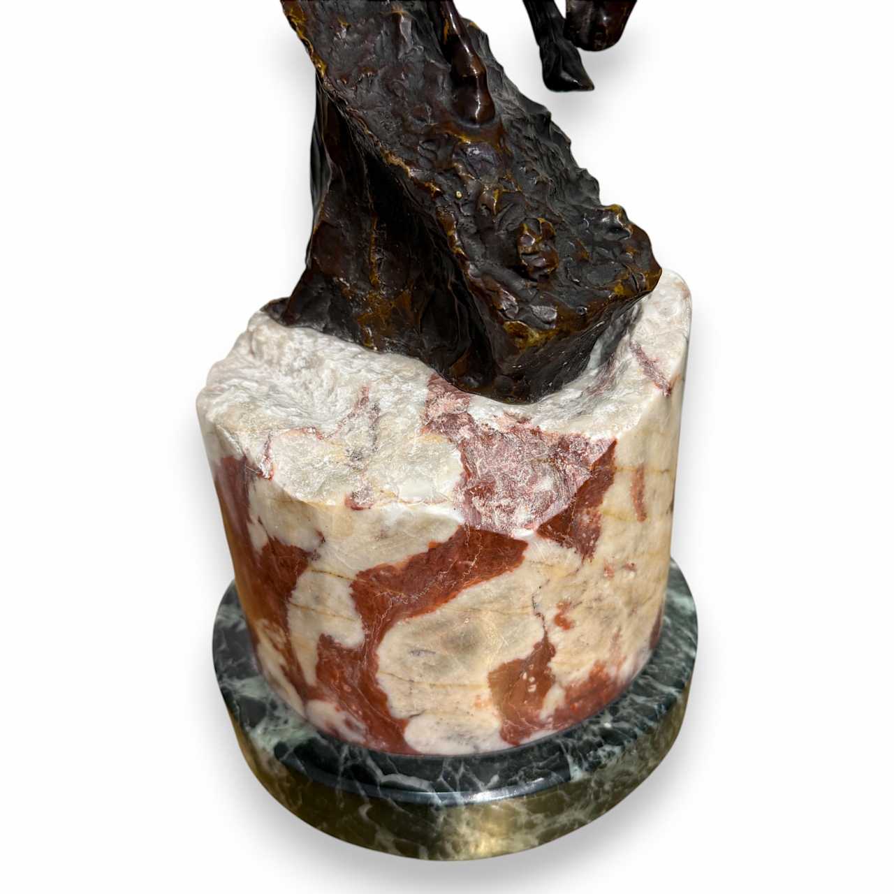 This striking bronze sculpture, attributed to the legendary American artist Frederic Remington, captures the essence of the rugged frontier spirit with breathtaking motion and anatomical precision. Titled “The Mountain Man,” the piece depicts a daring horseman and his mount descending a treacherous slope, the reins taut and tension palpable. This dramatic composition — one of Remington’s most iconic subjects — epitomizes the peril and tenacity of life in the American West.Remingtons mastery in rendering movement, detail, and raw emotion is on full display, from the horse’s poised limbs to the rider’s focused intensity. The sculpture is mounted on a beautifully striated red-and-white marble pedestal, set atop a darker marble plinth that provides striking visual contrast and stability.A collector’s piece of historical and artistic importance, this work is a tribute to the frontier mythos Remington helped define and immortalize. Ideal for connoisseurs of Western Americana, fine bronze sculpture, or late 19th to early 20th century American art.