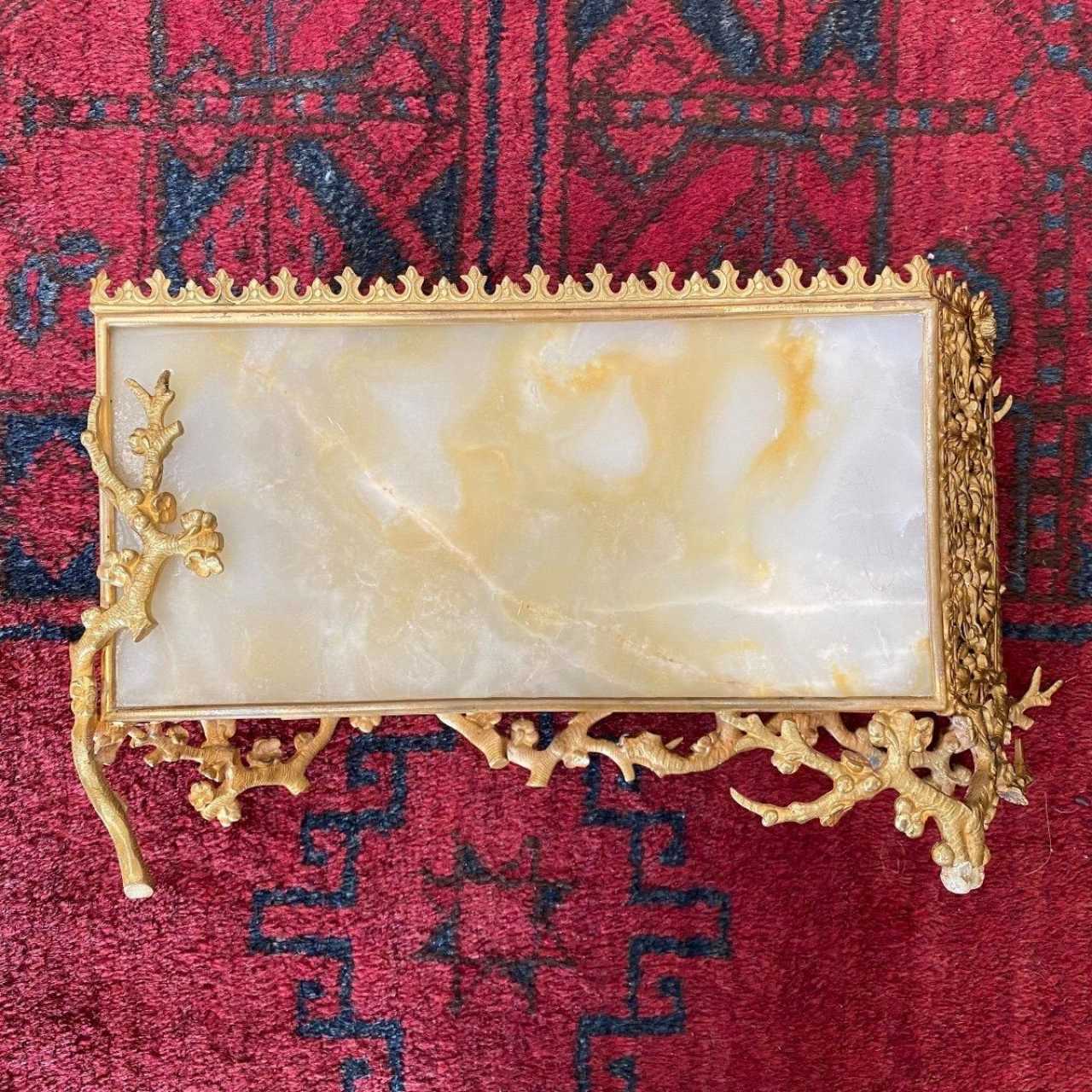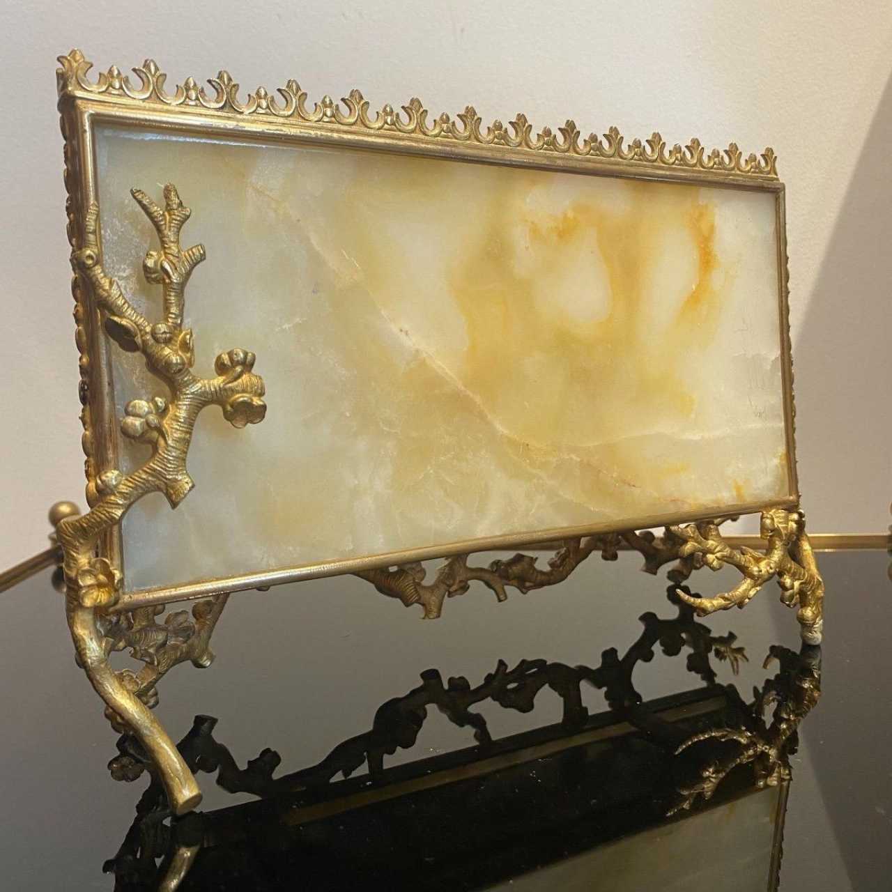 Gilded bronze and alabaster letter carrier in the Japanese style.The bronze tree branch decorations are very delicate. The alabaster plates on the two main sides give a very luminous look to this rare object.The sides are decorated with openwork gilded bronze plates with floral and plant motifs.ideal for an office or hallway.19th century.Perfect condition.