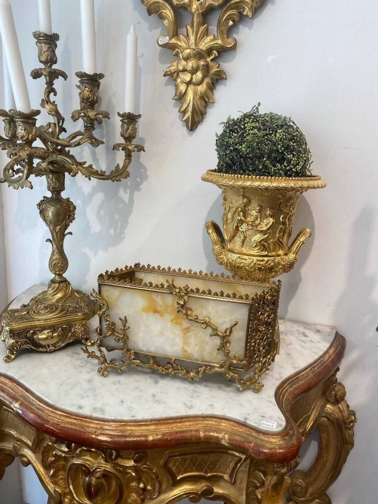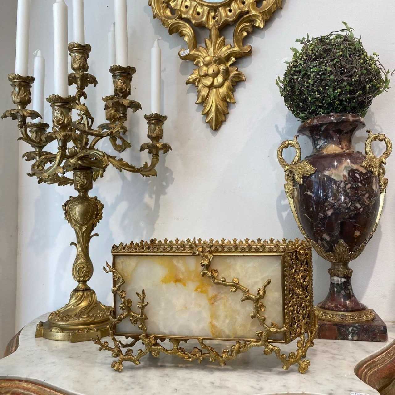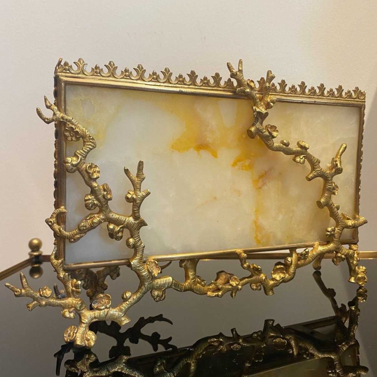 Gilded bronze and alabaster letter carrier in the Japanese style.The bronze tree branch decorations are very delicate. The alabaster plates on the two main sides give a very luminous look to this rare object.The sides are decorated with openwork gilded bronze plates with floral and plant motifs.ideal for an office or hallway.19th century.Perfect condition.
