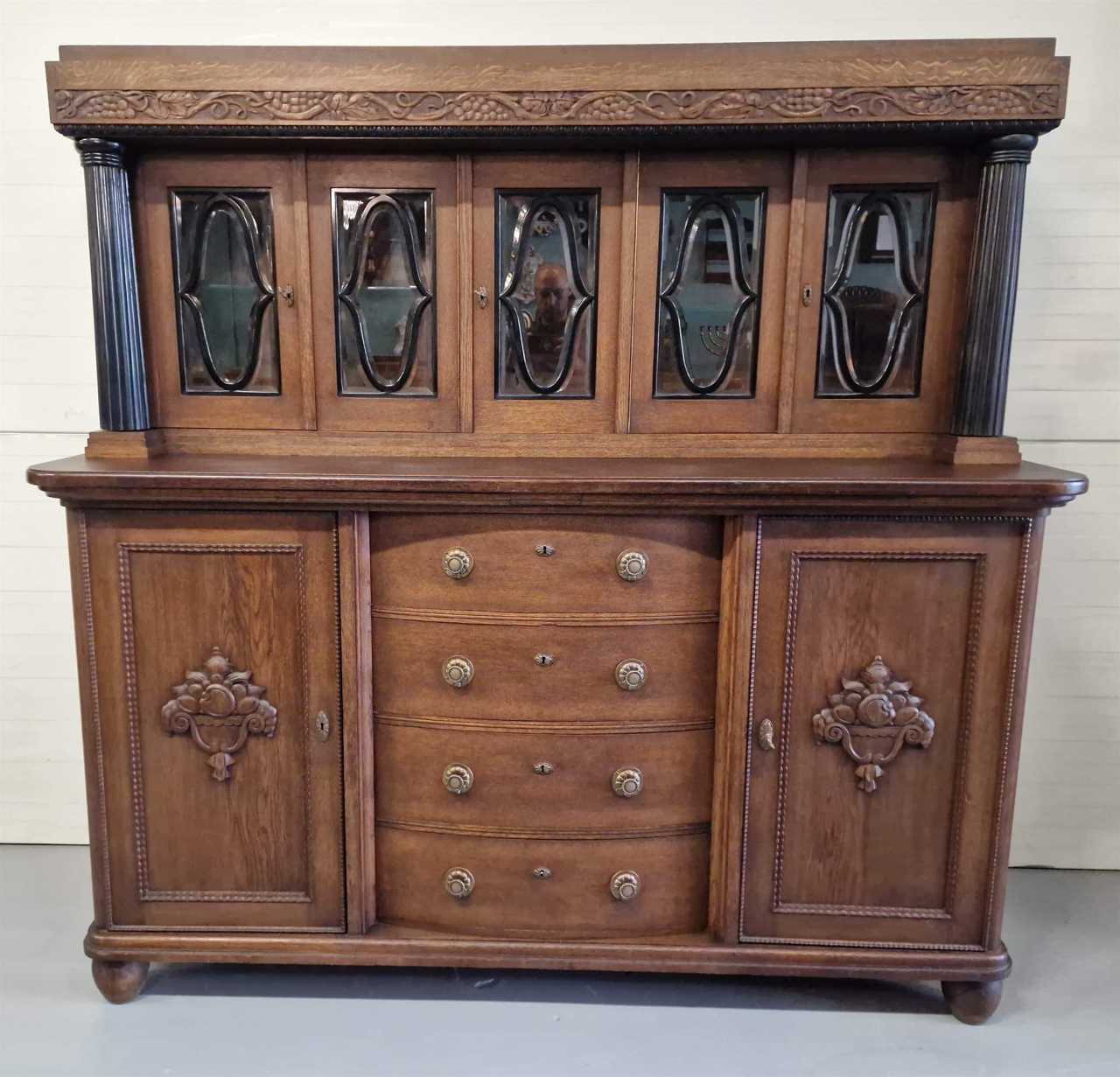 Grand et élégant buffet. Chêne, verre taillé. Allemagne. Années 1930. Dimensions : hauteur 195 cm ; longueur 201 cm ; profondeur 70 cm.