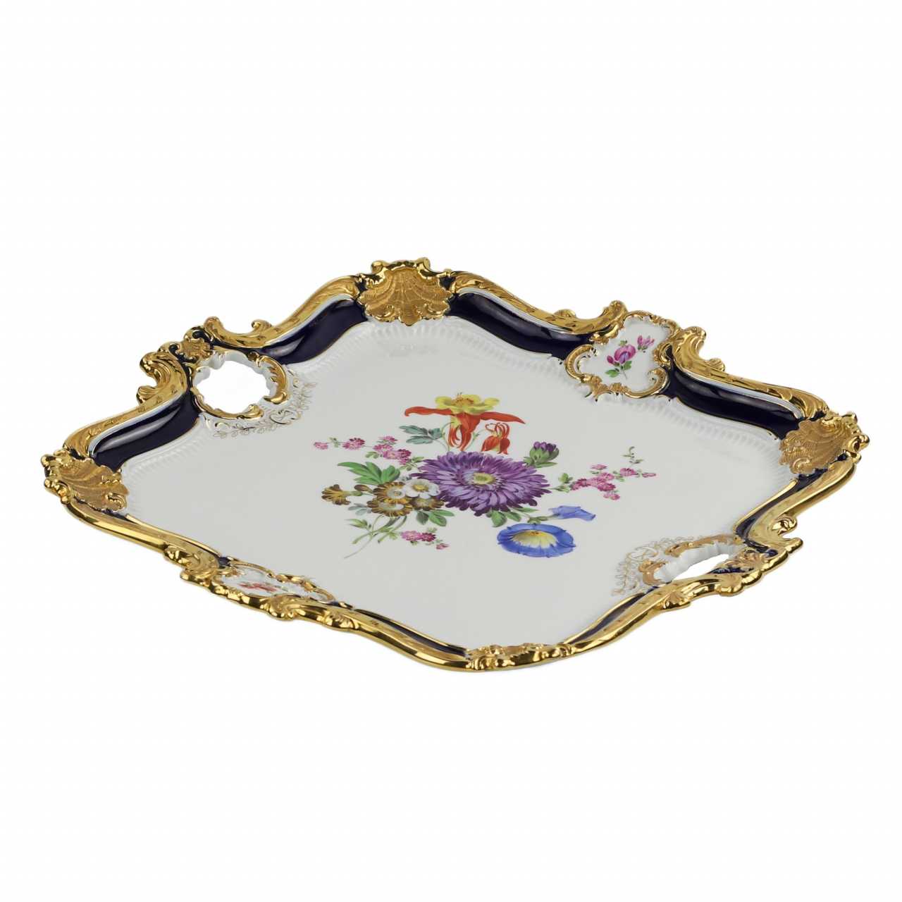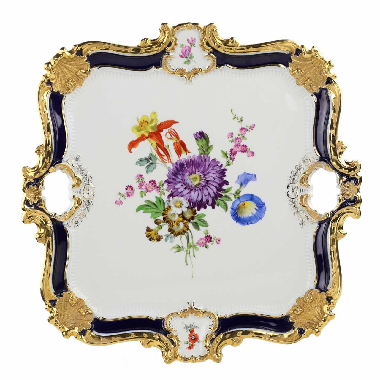 Grand plateau de service de la manufacture Meissen — remarquable exemple de la porcelaine allemande de la fin du XIXe au début du XXe siècle. Avec ses poignées ajourées, bordures rocailles rehaussées de cobalt et de dorures, le plateau présente un bouquet central peint à la main dans le style Blumenbukett, incluant aster, ipomée, narcisse et fleurs champêtres. Des cartouches floraux miniatures complètent le décor. Marques : Épées croisées bleues Meissen, sous glaçure, première qualité. Dimensions : Hauteur 3,5 cm × Longueur 41 cm × Largeur 41 cm. État : Bon état, légères traces d’usage.