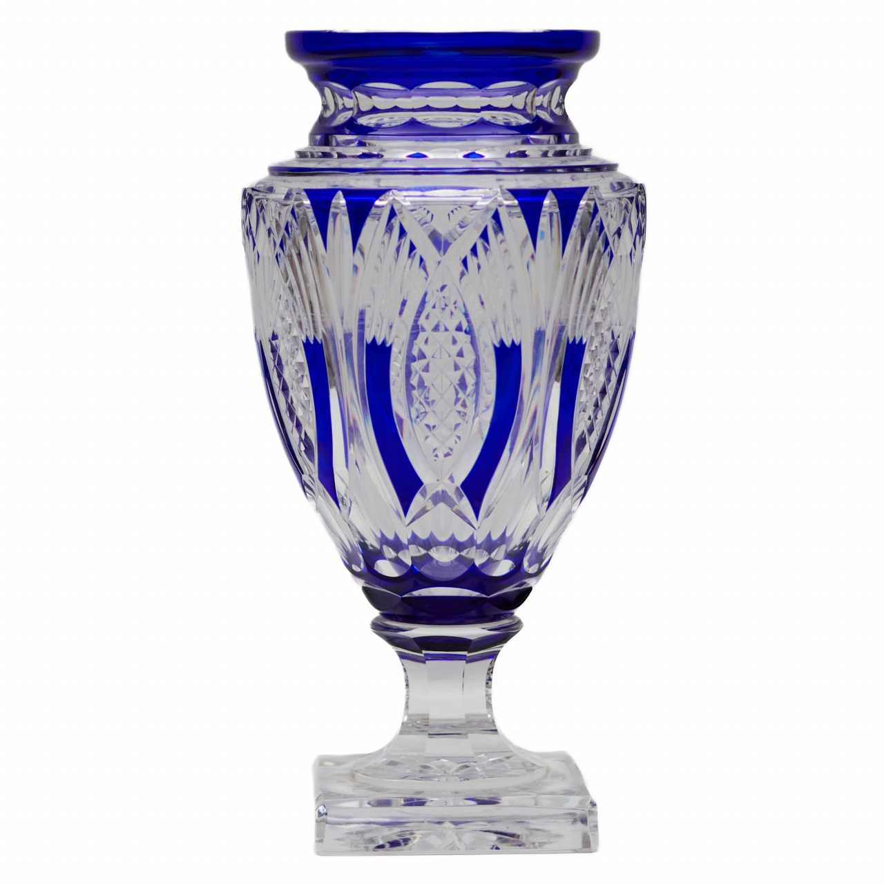 Grand vase en forme damphore en cristal coloré. Un meuble magnifique et remarquable. Fabriqué dans lesprit du cristal de Bohême de lépoque Biedermeier. Avec un corps gothique pointé vers le bas, un col large et étagé et une palette de couleurs de cristal blanc et bleu. Les segments décoratifs utilisent des motifs géométriques dovales et de céréales à épis. L’ensemble repose sur la puissance étincelante du pied facetté et de la base carrée. Hauteur : 40 cm.20ème siècle.