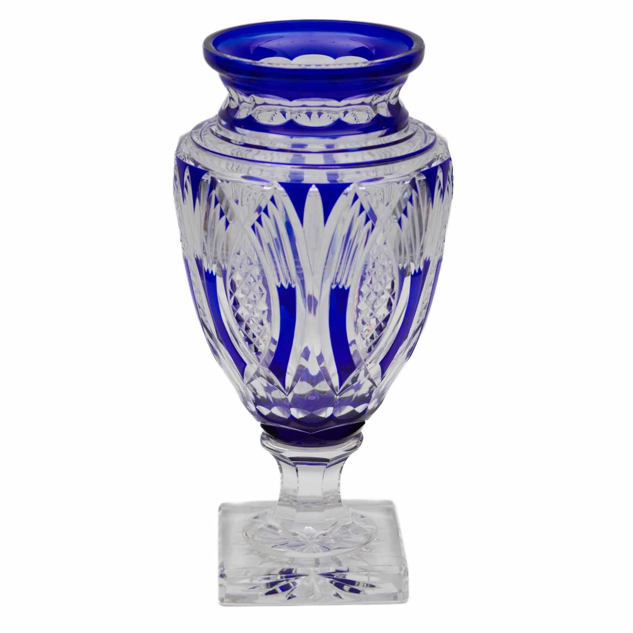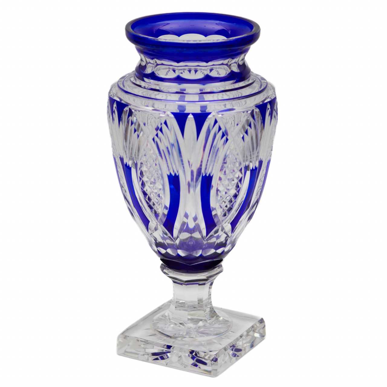 Grand vase en forme damphore en cristal coloré. Un meuble magnifique et remarquable. Fabriqué dans lesprit du cristal de Bohême de lépoque Biedermeier. Avec un corps gothique pointé vers le bas, un col large et étagé et une palette de couleurs de cristal blanc et bleu. Les segments décoratifs utilisent des motifs géométriques dovales et de céréales à épis. L’ensemble repose sur la puissance étincelante du pied facetté et de la base carrée. Hauteur : 40 cm.20ème siècle.