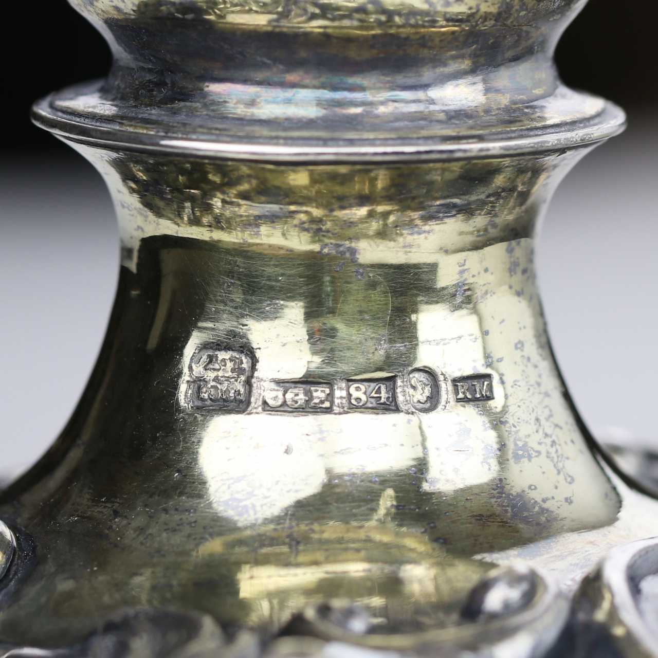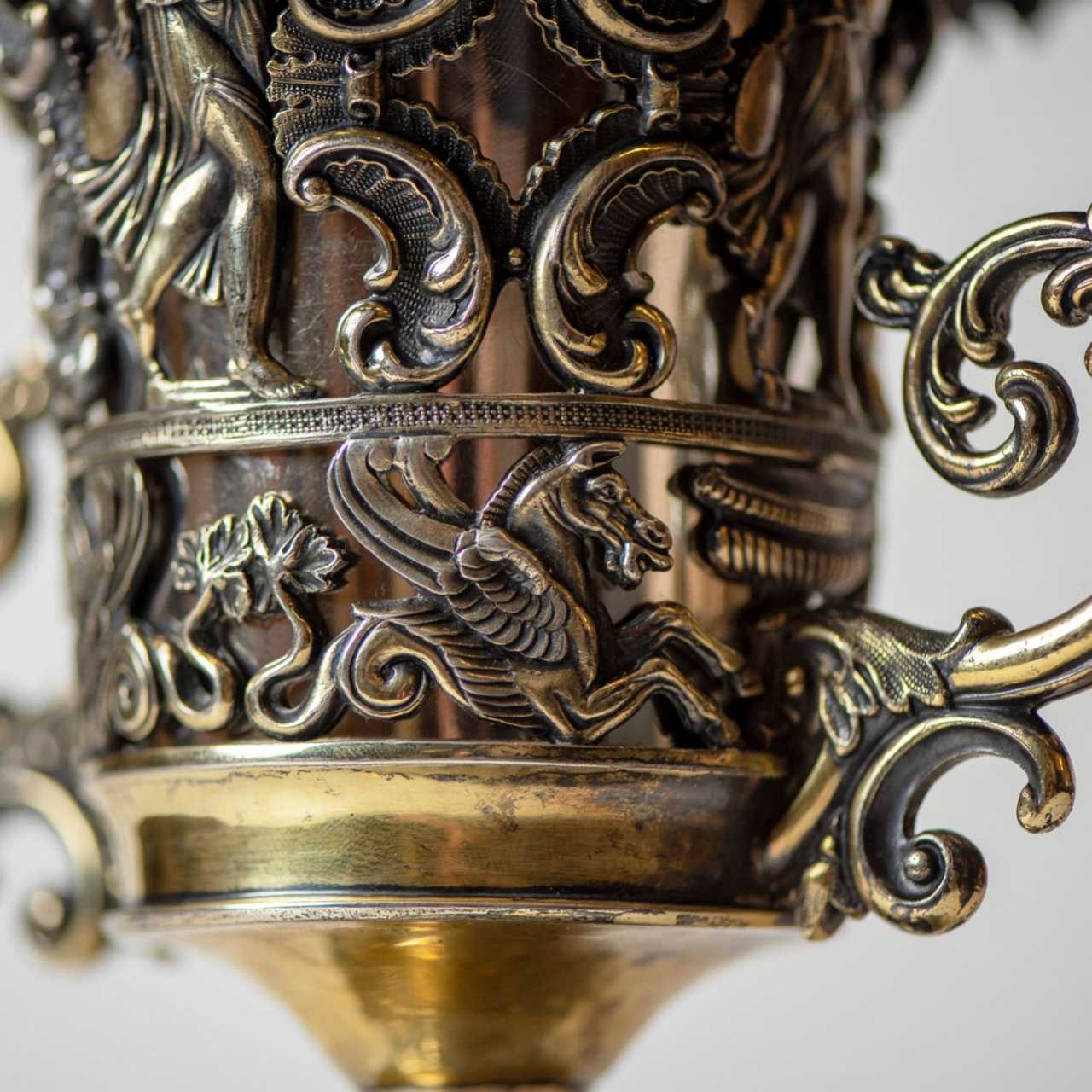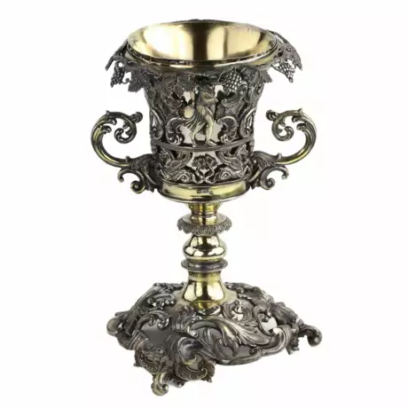 La grande coupe russe en argent, créée par le maître Ekquist Carl Gustav au milieu du 19e siècle, surprend par son savoir-faire exquis et sa riche décoration décorative. Le design de la coupe glorifie l`art de la vinification : d`élégantes guirlandes dorées de vignes avec des grappes de raisin s`entrelacent harmonieusement avec des figures de nymphes jouant de la musique, créant une atmosphère de sophistication ancienne. Les motifs rocailles avec des chevaux ailés et des pots de fleurs ajoutent de l`expressivité et du dynamisme à la composition. Les anses de la coupe, conçues en forme de vigne, créent un effet de sophistication sculpturale et de sophistication, faisant écho à l`esthétique du style classicisme. Le pied massif de la tasse est décoré d`un luxueux motif floral doré, où chaque détail est exécuté avec un savoir-faire et une attention aux détails incroyables. L`insert interne en argent souligne le côté pratique du produit, tout en complétant parfaitement son excellence artistique. initiales CGE dans un écu rectangulaire, indiquant le maître Ekkvist Carl Gustav ; cachet Bureau d`analyse de Saint-Pétersbourg avec des numéros 18 difficiles à lire ?? sous les lettres A.K., faisant vraisemblablement référence à Andrei Antonovich Kovalsky (1827-1856) ; marque du 84e étendard dans un écu rectangulaire, correspondant aux étendards en argent du milieu du XIXe siècle ; forme de la tête de Mercure dans un écu rond ; Marque inconnue avec les lettres latines RM. Dimensions : hauteur 27 cm, diamètre 18 cm Poids : 1098 g.