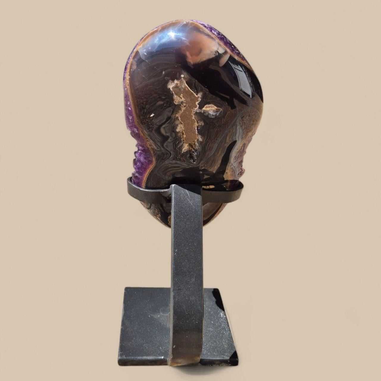 Ce rare spécimen de stalactite d&39;améthyste naturelle présente une exceptionnelle formation double en fleur. Cette pièce imposante présente une croissance cristalline d&39;un violet profond éclatant avec des motifs concentriques en forme de fleurs, caractéristiques des stalactites de haute qualité provenant d&39;Uruguay, une région réputée pour ses gisements d&39;améthyste de renommée mondiale. Au-delà de son impact visuel, ce spécimen est également apprécié pour ses propriétés métaphysiques. La formation florale en stalactite allie l&39;énergie spirituelle apaisante de l&39;améthyste à la haute énergie vibratoire de la croissance des stalactites. Fortement associée aux chakras de la couronne et du troisième œil, elle est censée favoriser la conscience spirituelle, la paix intérieure et l&39;équilibre émotionnel. Le motif floral naturel amplifie l&39;énergie du cristal, ce qui en fait une pièce puissante pour harmoniser l&39;énergie et favoriser une conscience supérieure. Montée sur un support métallique sur mesure, cette œuvre d&39;art minérale sculpturale est prête à être exposée. Il fait une déclaration, qu&39;il soit placé sur une console, dans une bibliothèque organisée ou comme point focal dans un cabinet de curiosités. Une pièce de collection qui allie merveille naturelle et élégance décorative. Origine : Uruguay Matériau : Stalactite en grappe d&39;améthyste naturelle Affichage : Support en métal noir personnalisé inclus État : Excellent - face naturelle et non polie