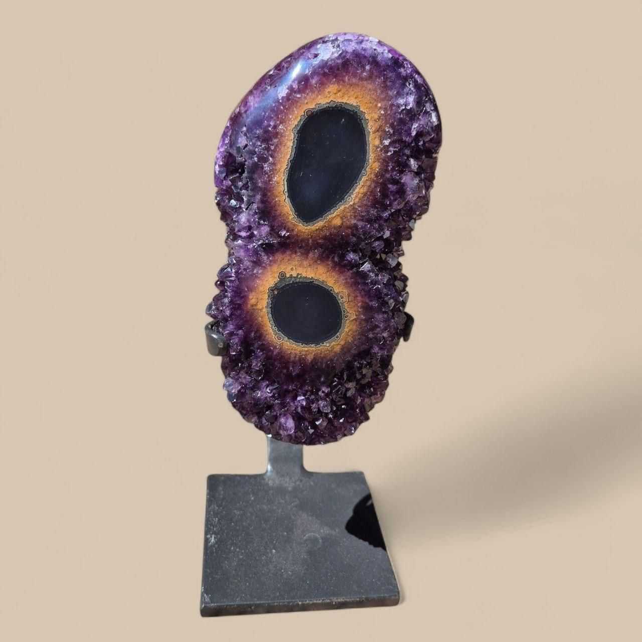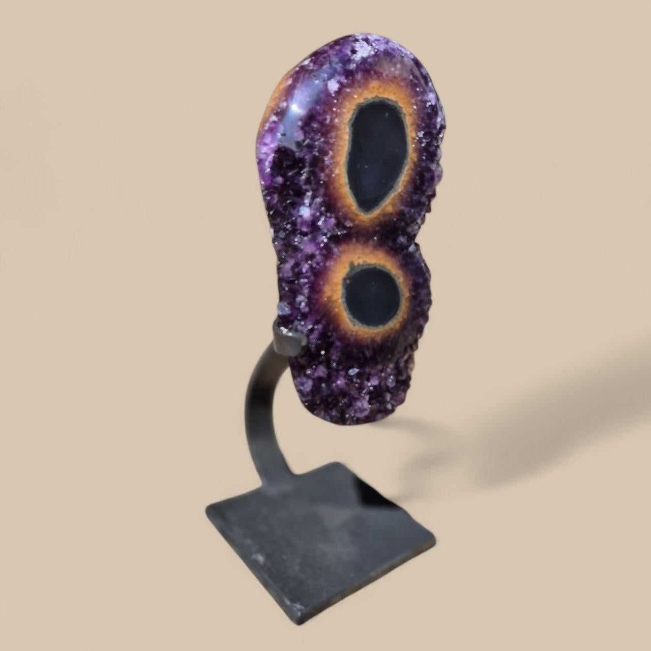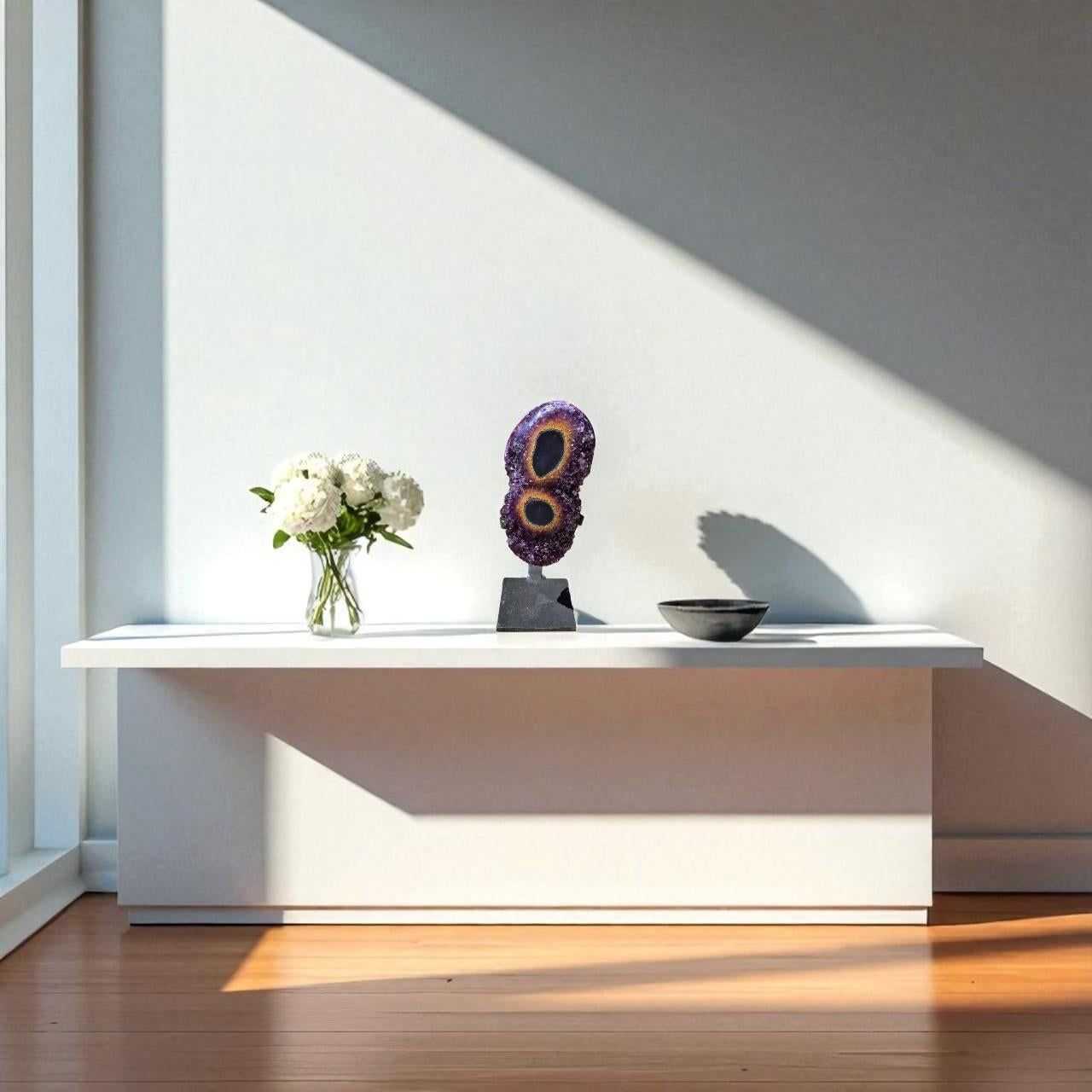 Ce rare spécimen de stalactite d&39;améthyste naturelle présente une exceptionnelle formation double en fleur. Cette pièce imposante présente une croissance cristalline d&39;un violet profond éclatant avec des motifs concentriques en forme de fleurs, caractéristiques des stalactites de haute qualité provenant d&39;Uruguay, une région réputée pour ses gisements d&39;améthyste de renommée mondiale. Au-delà de son impact visuel, ce spécimen est également apprécié pour ses propriétés métaphysiques. La formation florale en stalactite allie l&39;énergie spirituelle apaisante de l&39;améthyste à la haute énergie vibratoire de la croissance des stalactites. Fortement associée aux chakras de la couronne et du troisième œil, elle est censée favoriser la conscience spirituelle, la paix intérieure et l&39;équilibre émotionnel. Le motif floral naturel amplifie l&39;énergie du cristal, ce qui en fait une pièce puissante pour harmoniser l&39;énergie et favoriser une conscience supérieure. Montée sur un support métallique sur mesure, cette œuvre d&39;art minérale sculpturale est prête à être exposée. Il fait une déclaration, qu&39;il soit placé sur une console, dans une bibliothèque organisée ou comme point focal dans un cabinet de curiosités. Une pièce de collection qui allie merveille naturelle et élégance décorative. Origine : Uruguay Matériau : Stalactite en grappe d&39;améthyste naturelle Affichage : Support en métal noir personnalisé inclus État : Excellent - face naturelle et non polie