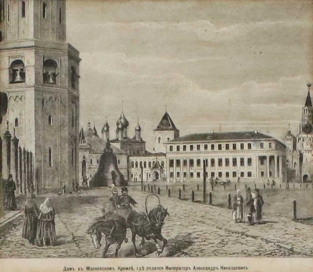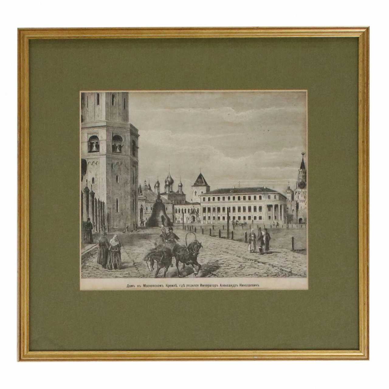 Gravure Maison du Kremlin de Moscou, où est ne l`empereur Alexandre Nikolaïevitch encadree sous verre.