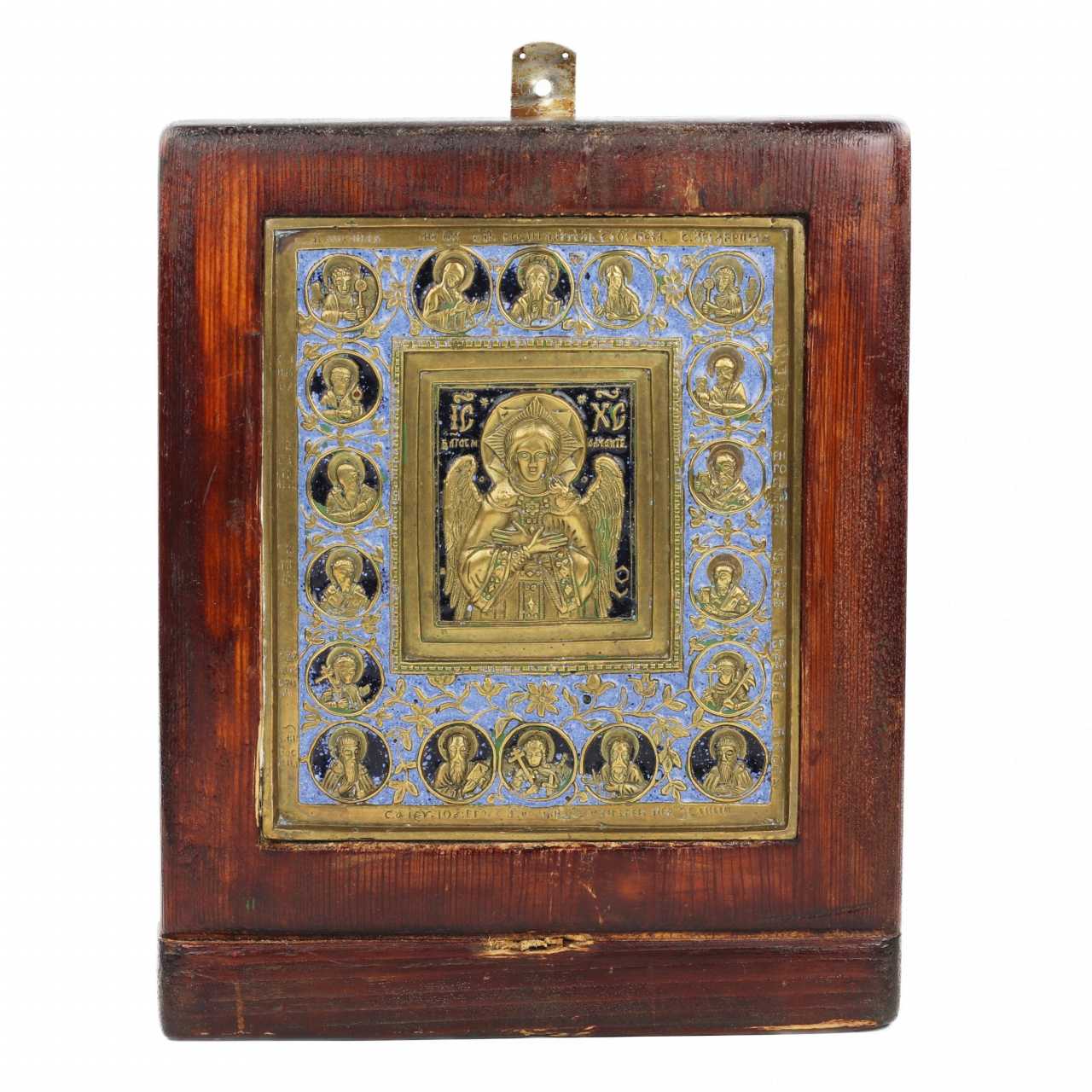 Rare icône en bronze coulé « Le Christ du Saint Silence » (Spas Blagoe Molchanie) avec dix-huit saints sélectionnés, ornée d’émail chaud bicolore — bleu foncé et blanc. L’image centrale représente le Christ sous forme de l’Ange du Grand Conseil, avec ailes, sceptre et nimbe rayonnant, portant l’inscription traditionnelle IC XC. La composition est entourée de dix-huit médaillons circulaires avec bustes de saints, chacun nommé. Le fond est orné d’un décor floral, des inscriptions liturgiques slavonnes encadrent l’icône en haut et en bas. Produite dans des ateliers de fonderie à Moscou et dans l’Oural, cette icône était destinée à la dévotion domestique. Elle se distingue par la qualité du moulage, la conservation de l’émail et l’expression décorative.Dimensions : Icône : 15 × 12,5 cm, Kiot : Hauteur 22 cm, Largeur 18 cmÉtat : Icône en bon état de collection. Émail intact, image nette. Traces d’usure mineures conformes à l’âge.Provenance : Russie, fin du XIXe siècle