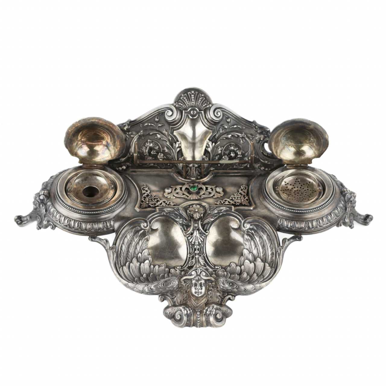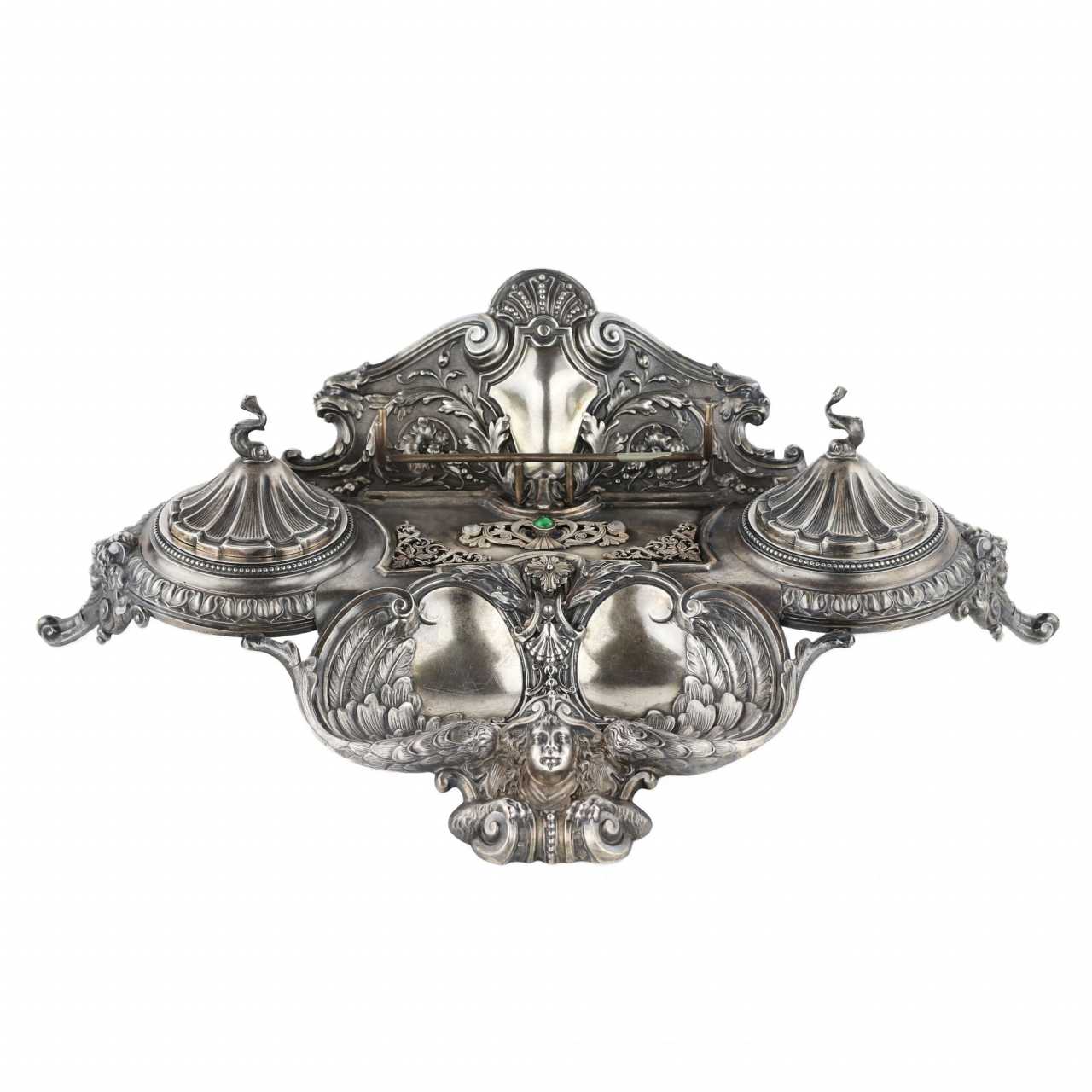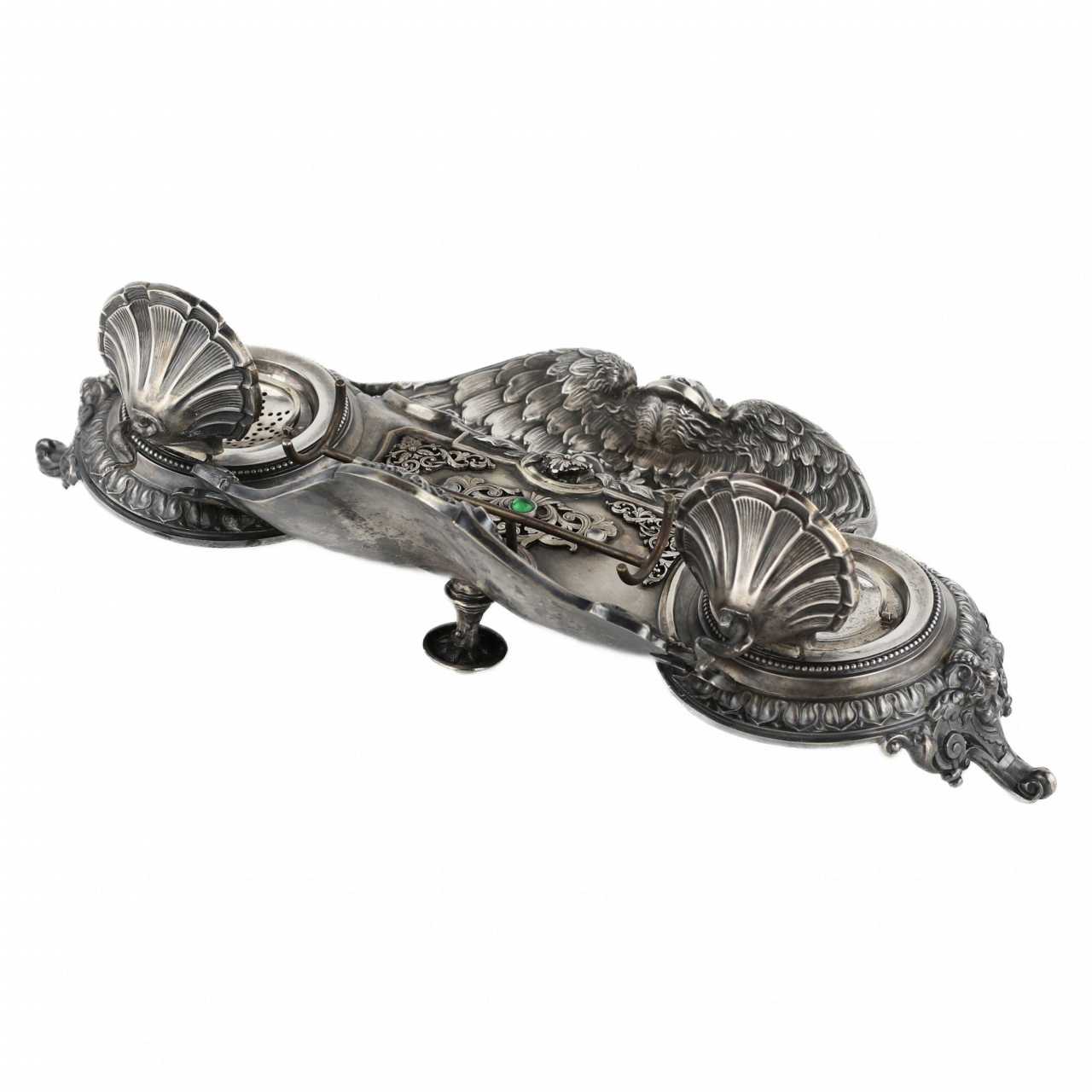 Un excellent instrument d`écriture en argent, créé par la société Fabergé à la fin du 19e siècle, est un exemple exceptionnel de l`art joaillier de son époque. Il fait partie intégrante de la décoration du meuble et impressionne par son design exquis, qui combine des éléments de décor floral avec un thème marin. La façade de l`appareil représente la Sirène, une créature mythologique avec un torse féminin et une partie inférieure d`oiseau. . La sirène symbolise la tromperie et la séduction, incarnant les dangers du monde matériel qui peuvent tenter l`esprit sur le chemin de ses objectifs. Les couvercles de l`appareil sont réalisés en forme de coquillages, ce qui confère au produit un élément de l`élément marin enchanteur. Des figurines décoratives de dauphins situées sur les couvercles soulignent le lien avec la mer et ajoutent du dynamisme et de la grâce aux produits. L`instrument d`écriture est présenté dans un élégant coffret en bois. Poinçons : la marque complète de la société Fabergé, la marque de l`orfèvre Henrik Wigström (. HW), le poinçon de Saint-Pétersbourg du dernier quart du XIXe siècle avec l`image des armoiries de la ville et les chiffres 84, confirmant l`étalon argent. Dimensions du produit : 30 cm x 22 cm Poids : 608 grammes.