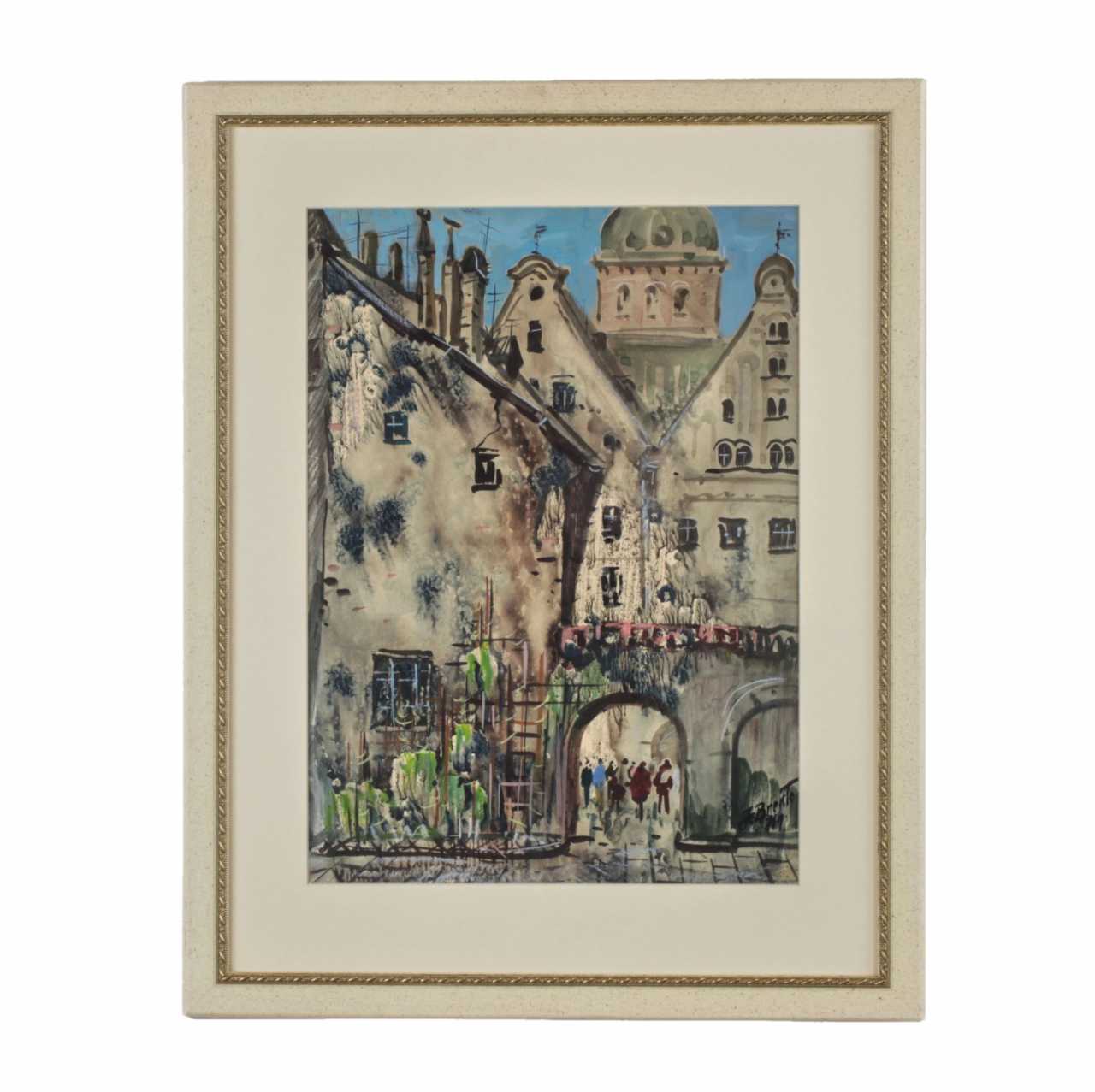Janis Brekte. Aquarelle Old Riga. 1971. L`œuvre de l`un des chanteurs emblematiques et distinctifs de la vieille ville, seconde moitie du XXe siècle. Signature et date dans le coin inferieur droit. La taille du tableau sans cadre: 54 x 40 cm.